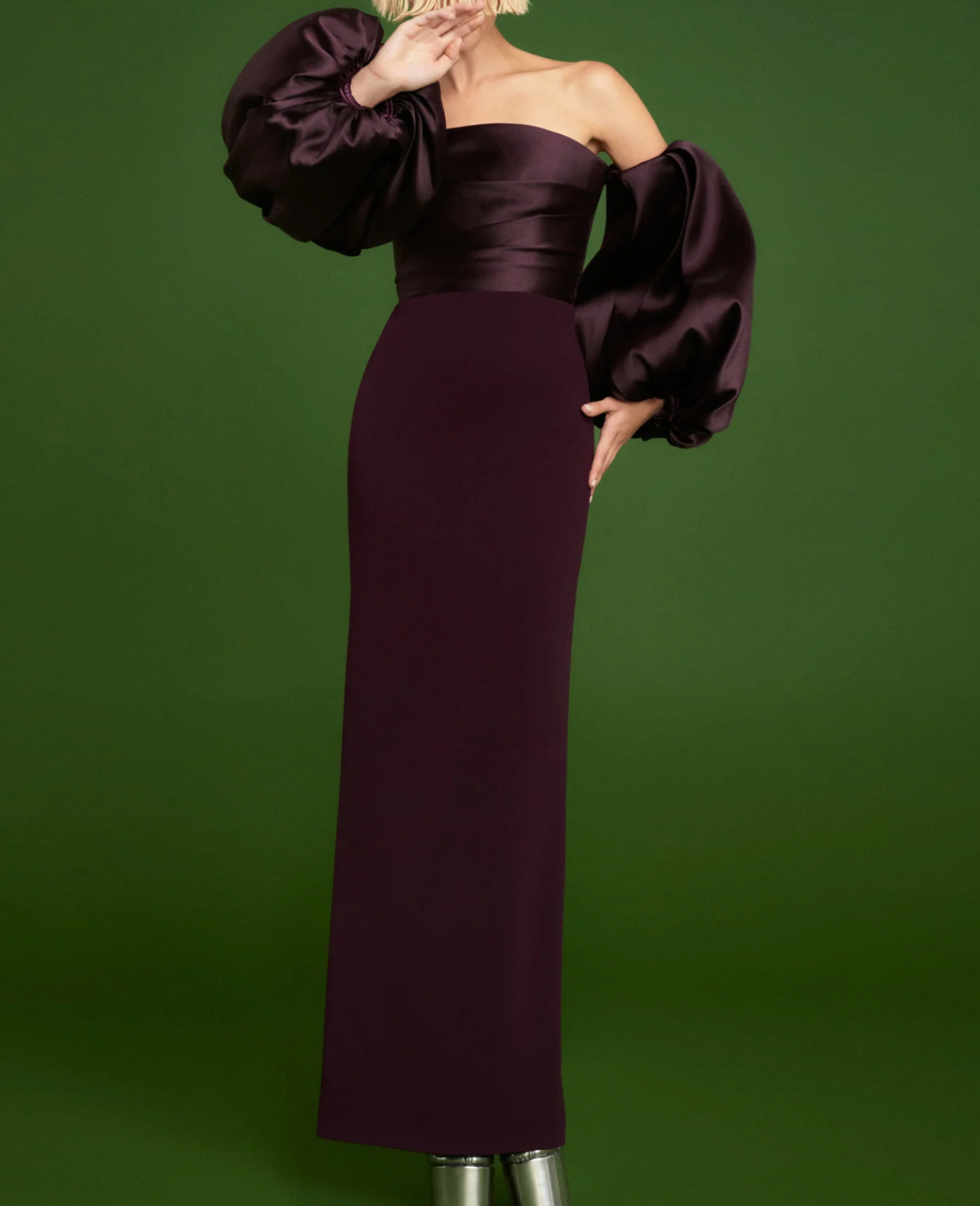 فستان سهرة أنيق مكشوف الأكتاف بلون باذنجاني غامق، يتميز بصدرية ساتان لامعة مع تفاصيل لف ناعمة مطوية وأكمام واسعة. تنورته العمودية الأنيقة تُضفي عليه لمسة راقية، تجمع بين الأناقة والدراما في تناغم مثالي. قطعة مميزة للمناسبات الراقية والسهرات الرسمية.