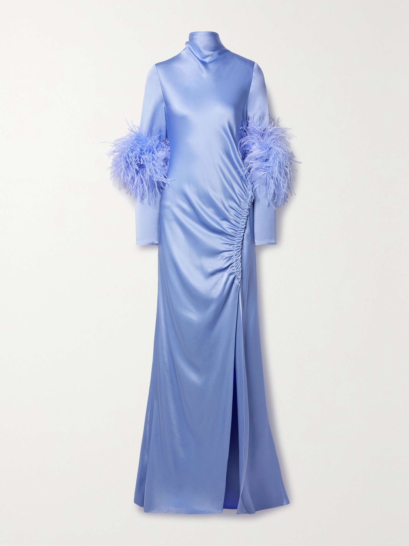 فستان ساتان بأكمام من الريش وشق مكشكش – إيميرالد فلير