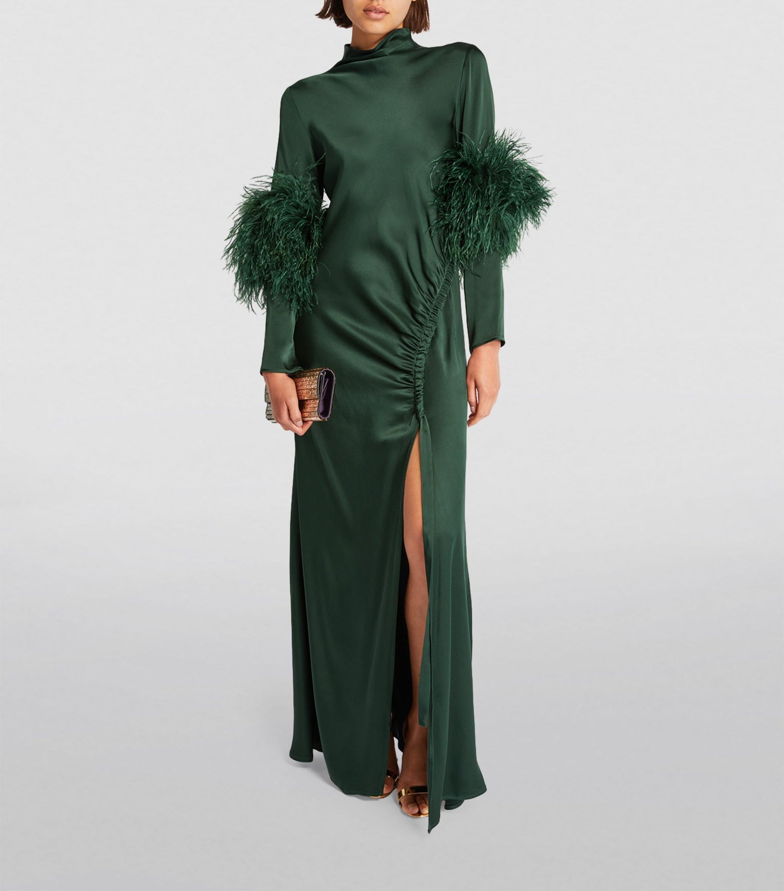 فستان ساتان زمردي فاخر يتميز بأكمام مزينة بالريش، وثنيات جانبية أنيقة، وشق يصل إلى الفخذ، مصمم ليكون بمثابة بيان للأناقة الجريئة والجاذبية.