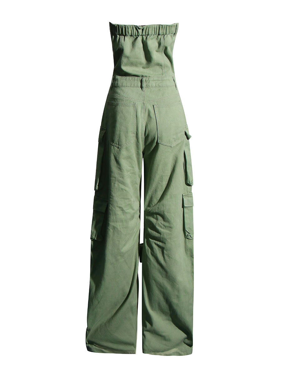جمبسوت كارغو جريء بدون حمالات يتميز بصدرية منظمة، وجيوب عملية، وقصة واسعة الساقين - مثالي لإطلالة عصرية واثقة.