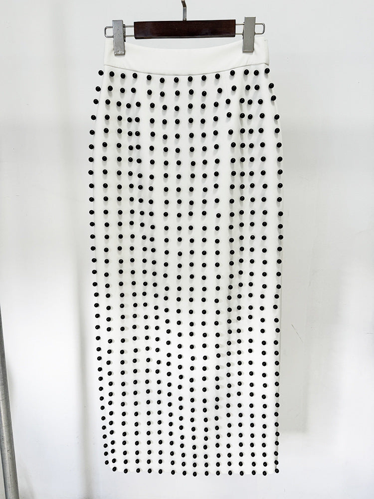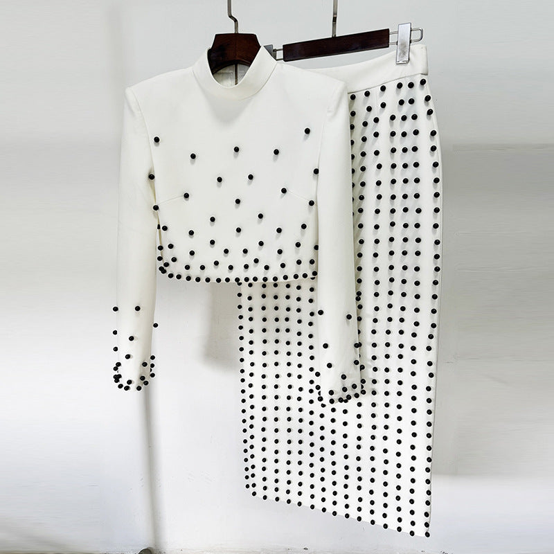 ملفت للنظر ومنظم، هذا الزي المكون من قطعتين طقم يمزج بين التفصيل الحاد والزينة الحديثة. يتميز الجزء العلوي الأبيض النقي بوسادات كتف مبالغ فيها وياقة عالية للحصول على صورة ظلية قوية، بينما التنورة العمودية ذات الخصر العالي المتطابقة مزينة بمسامير سوداء موضوعة بعناية لخلق تأثير أنيق ومطول. أنيق بحافة مستقبلية، هذا المظهر مثالي للأمسيات العصرية، أو لحظات المدرج، أو المناسبات اللافتة للنظر.