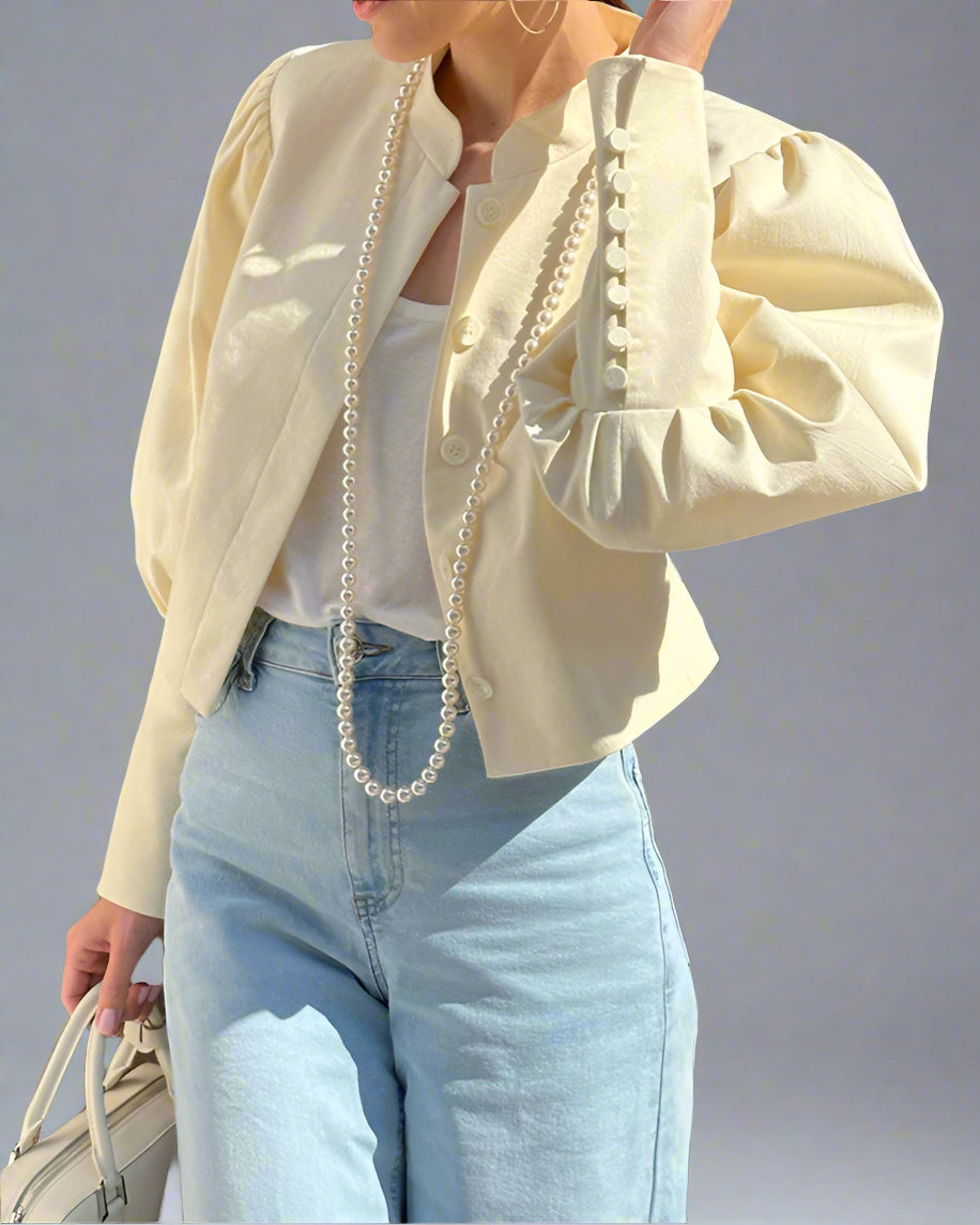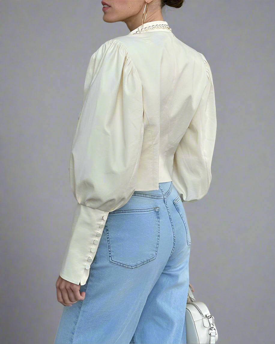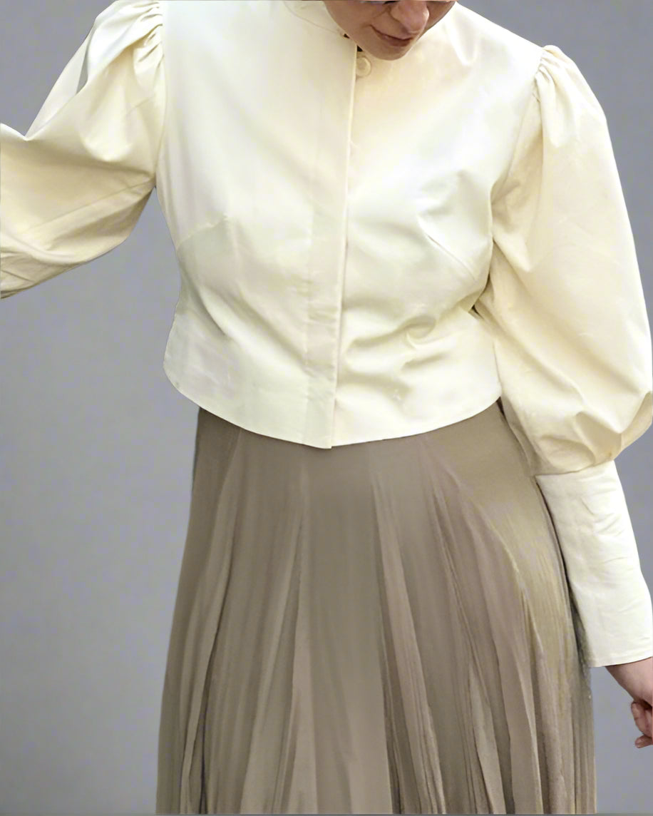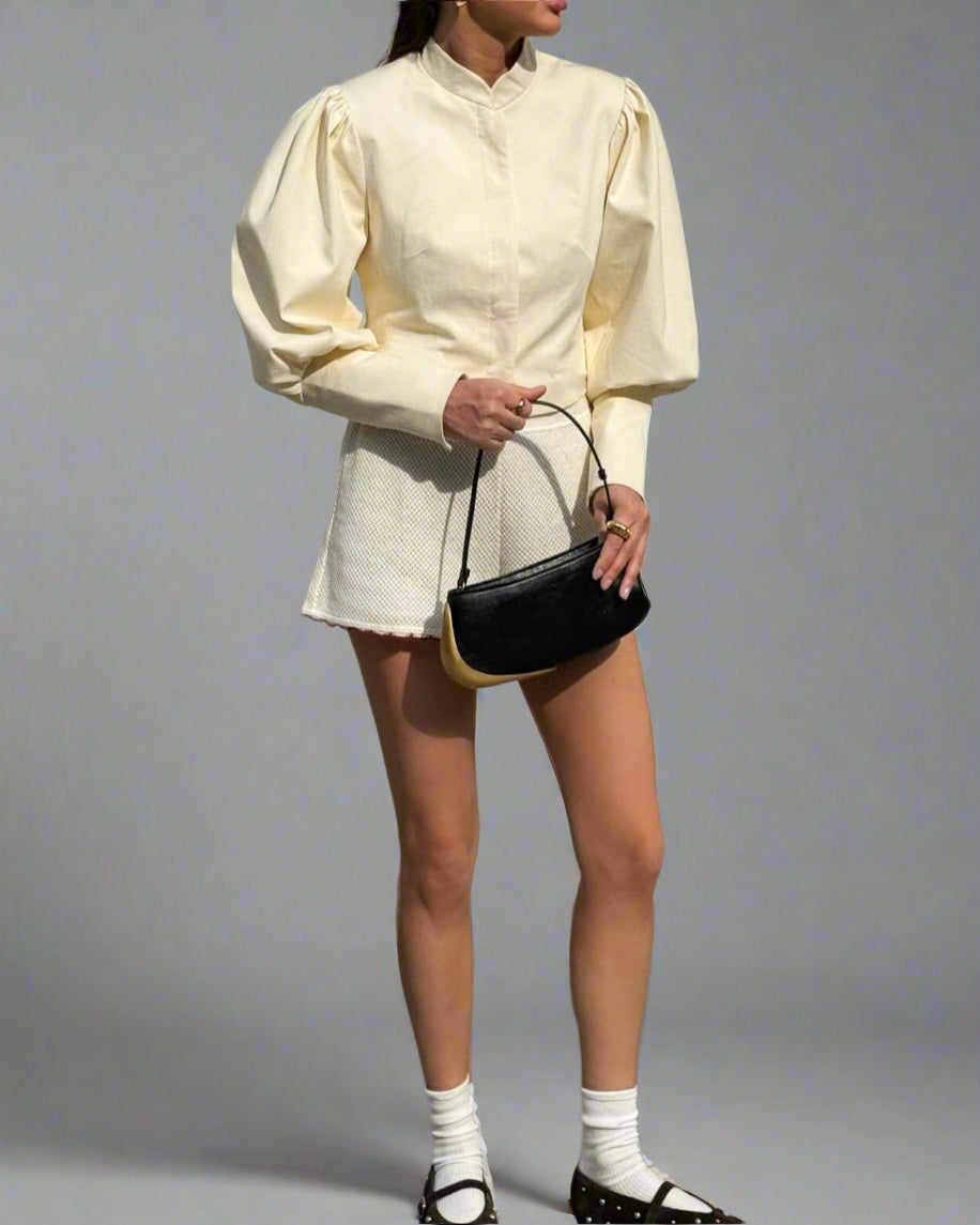 قميص قصير أنيق مصمم بأكمام منتفخة واسعة وياقة واقفة أنيقة، مما يوفر لمسة عصرية على الأناقة الخالدة.