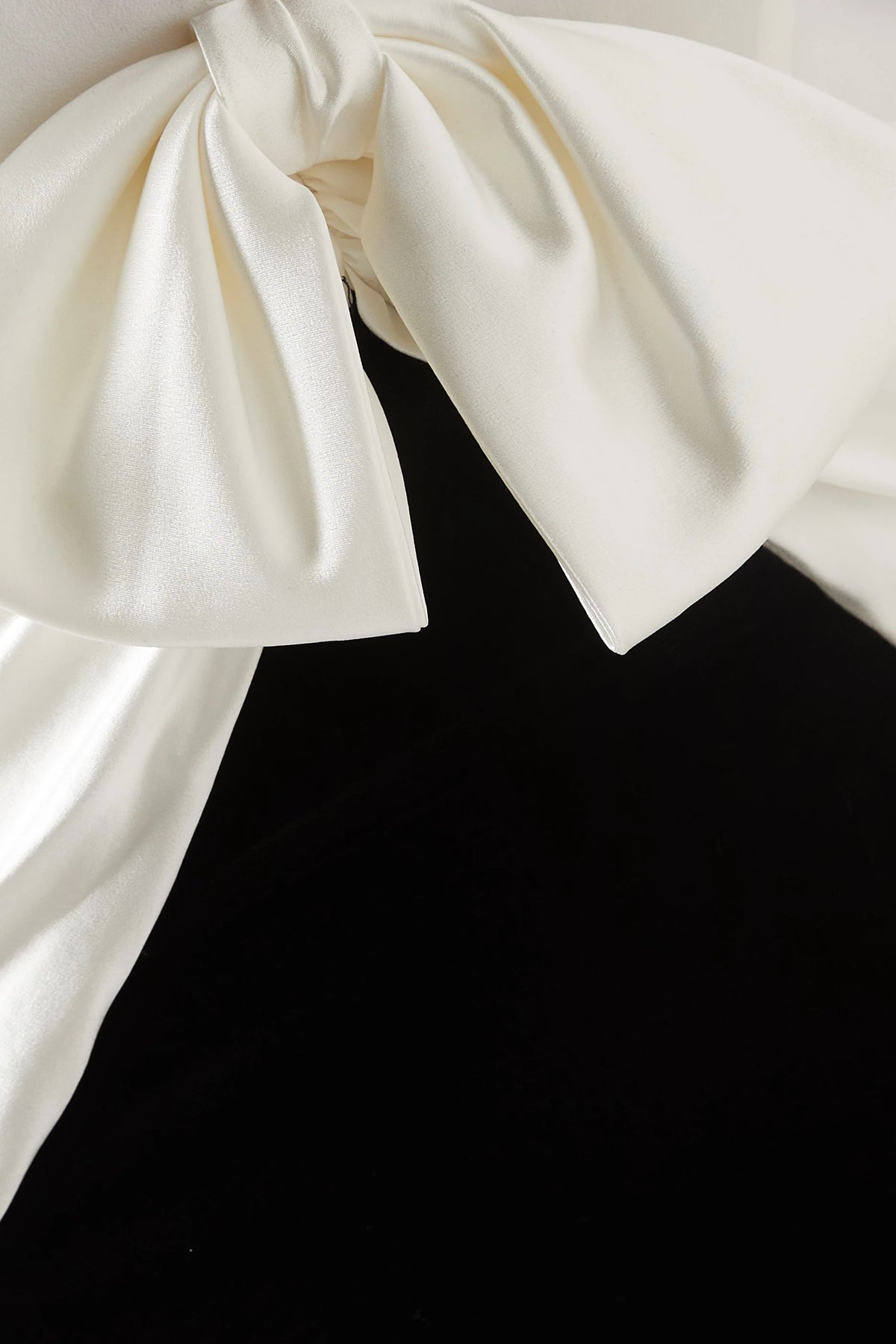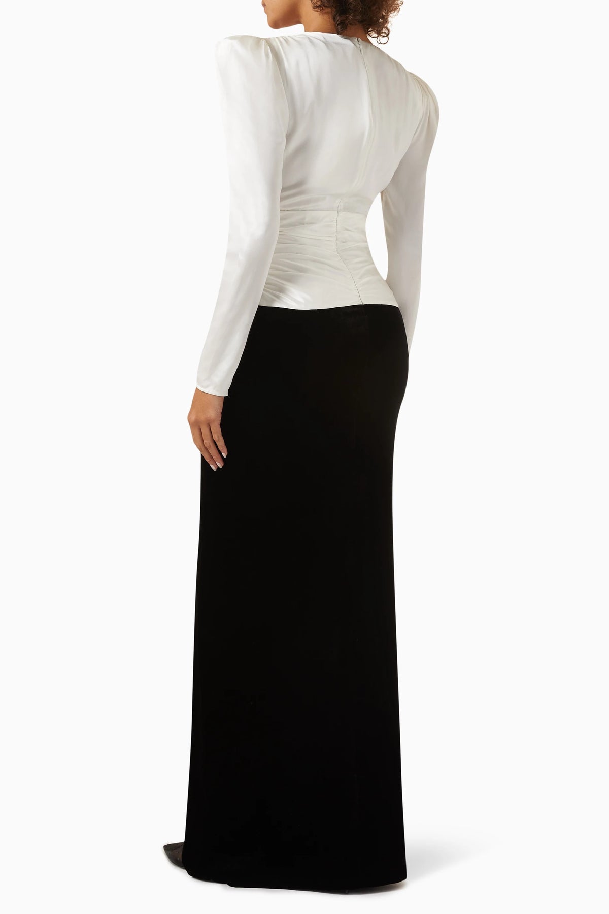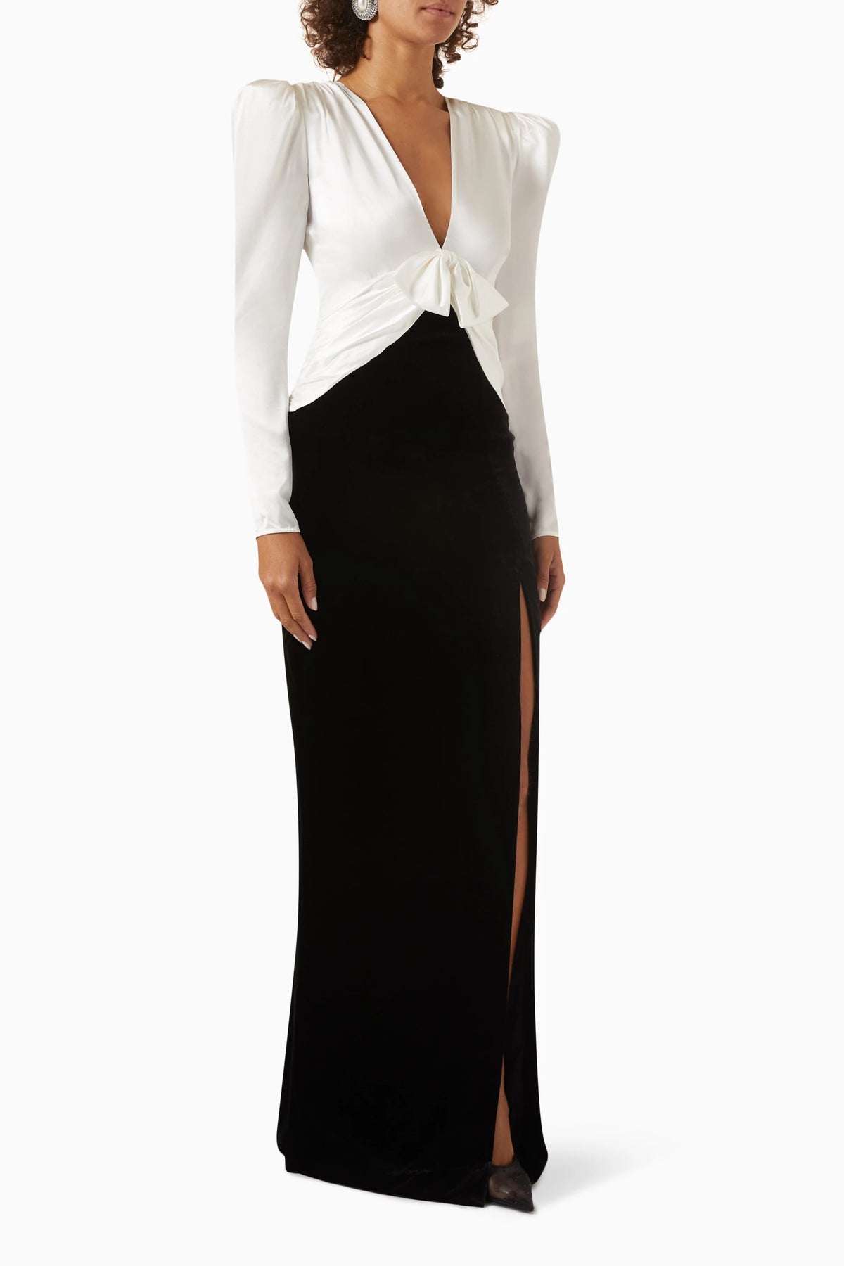 فستان أحادي اللون جذاب، يتميز بجزء علوي من الساتان الأبيض اللامع، وياقة منخفضة وتفاصيل فيونكة، مع تنورة مخملية سوداء أنيقة وشق جريء يصل إلى الفخذ - مزيج رائع من الأناقة والرقي.
