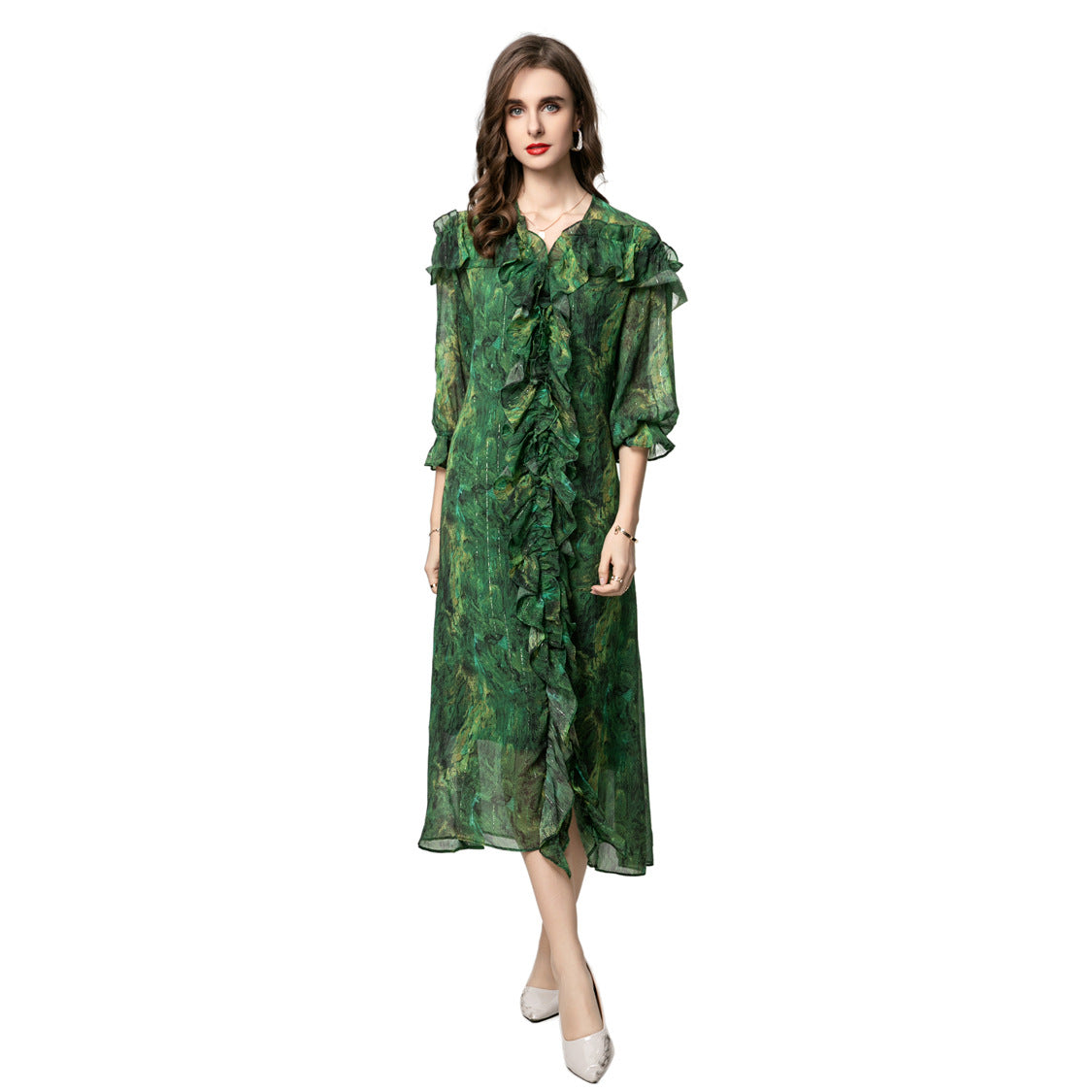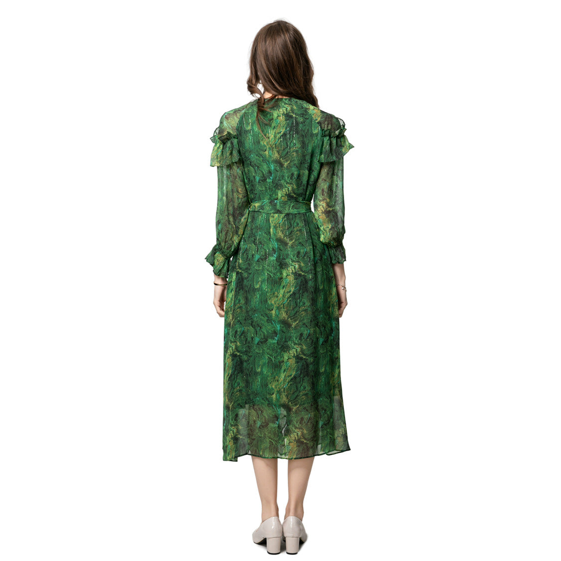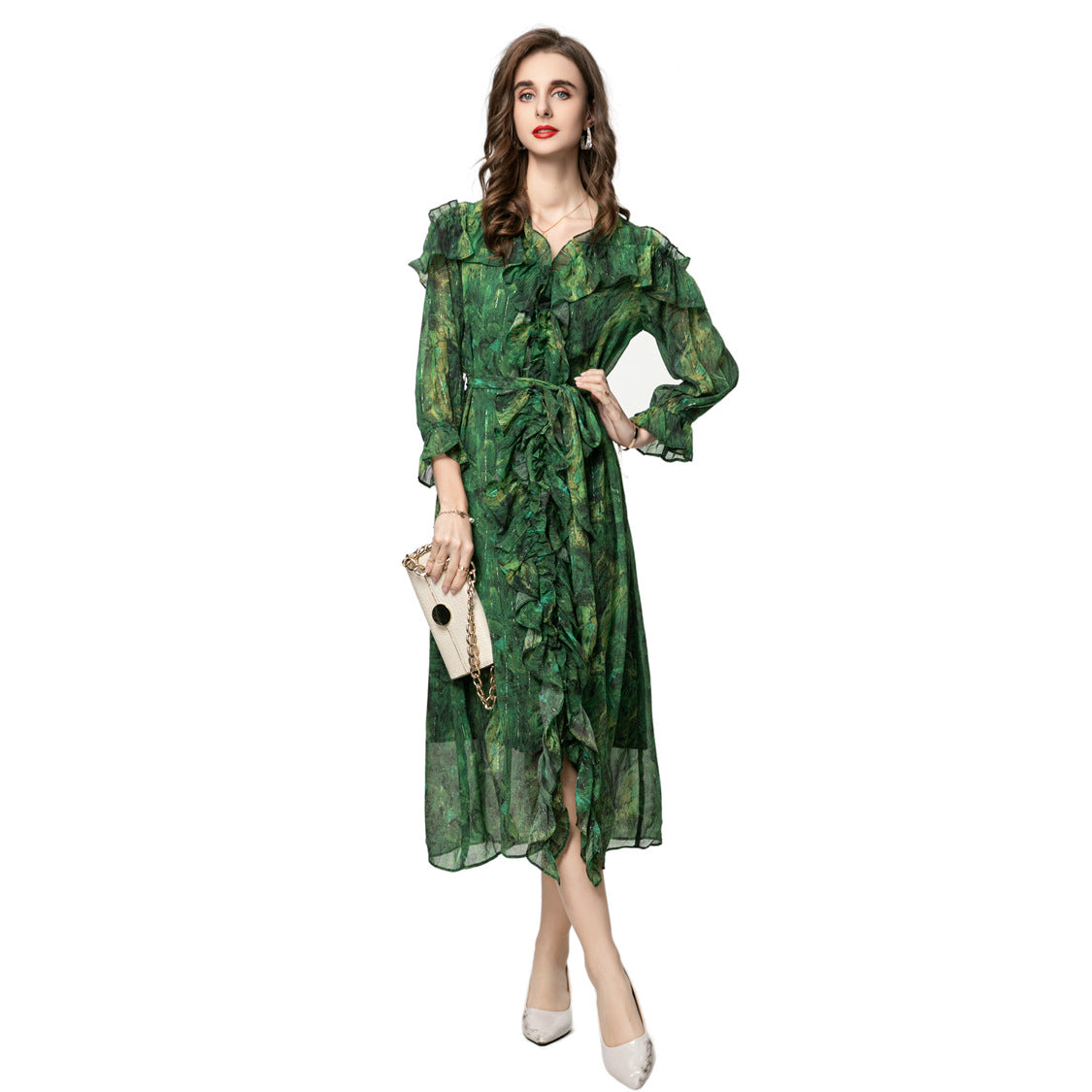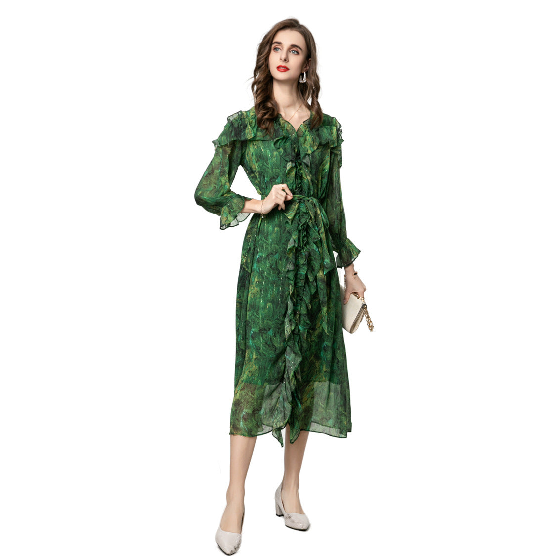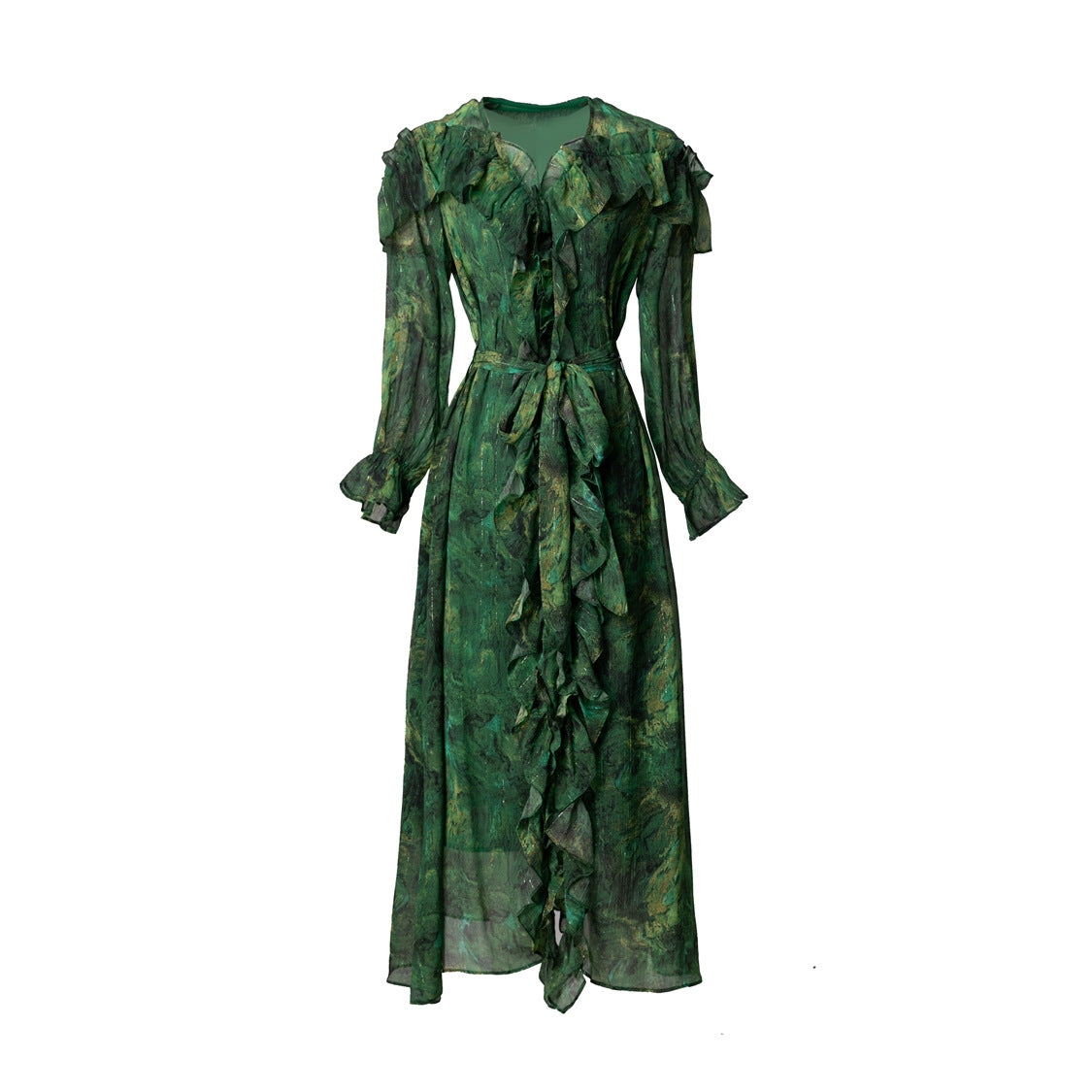 فستان شيفون ملفوف متوسط ​​الطول مع حواف مكشكشة – إيميرالد ويسبر