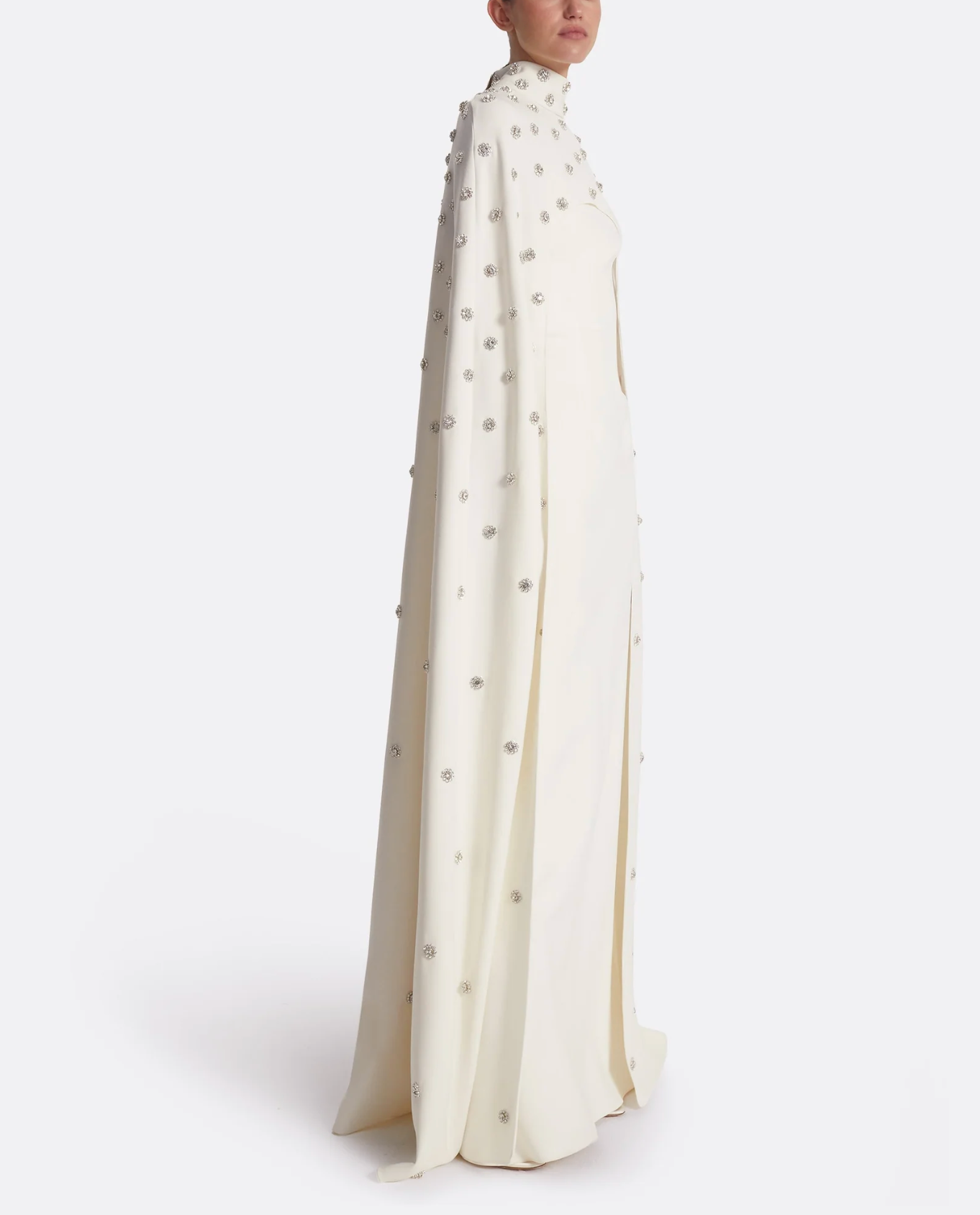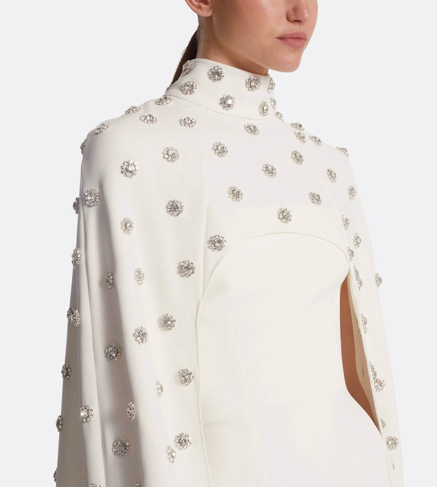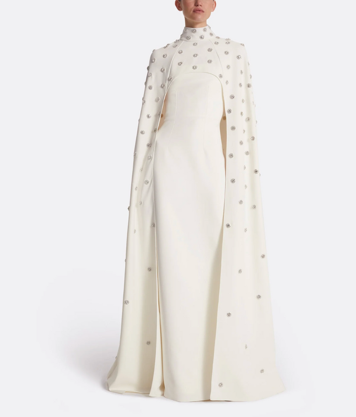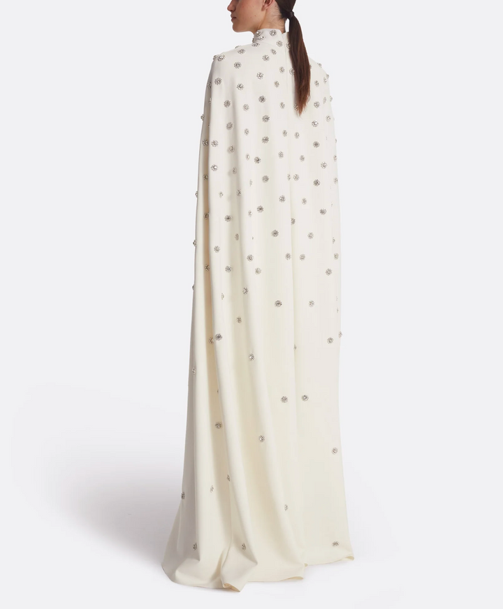 فستان عاجي متألق بتصميمه المنحوت وعباءته عالية الرقبة، مزين بتطريزات كريستالية رقيقة. فخم، متألق، ومثالي للمناسبات الرسمية أو الاحتفالية.
