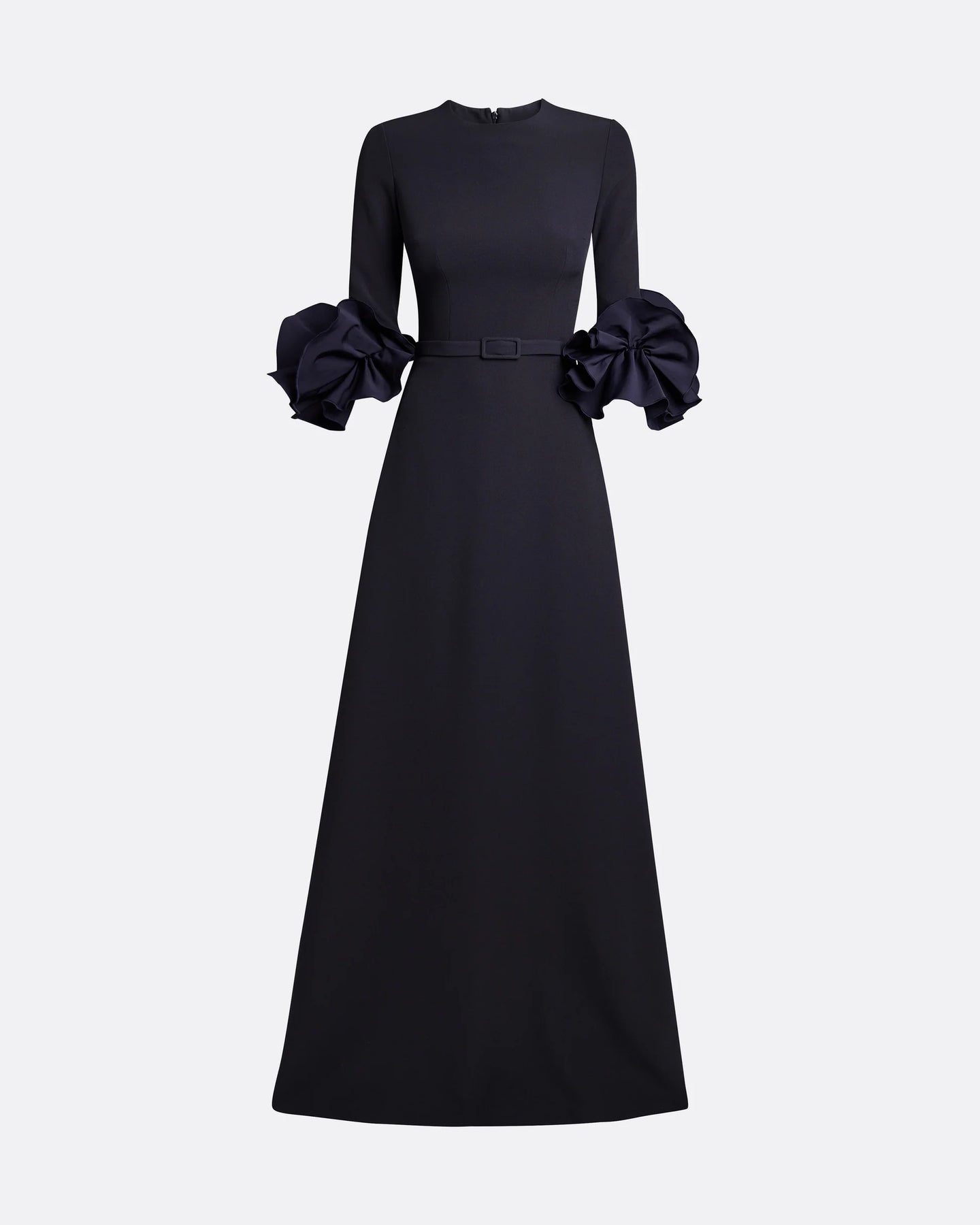 هذا الفستان الأسود الأنيق ذو التصميم الفني على شكل حرف A يتميز بخصر أنيق مزود بحزام وأساور زهرية منحوتة جريئة تتفتح من الأكمام متوسطة الطول. مزيج مثالي بين البساطة والأناقة الراقية.
