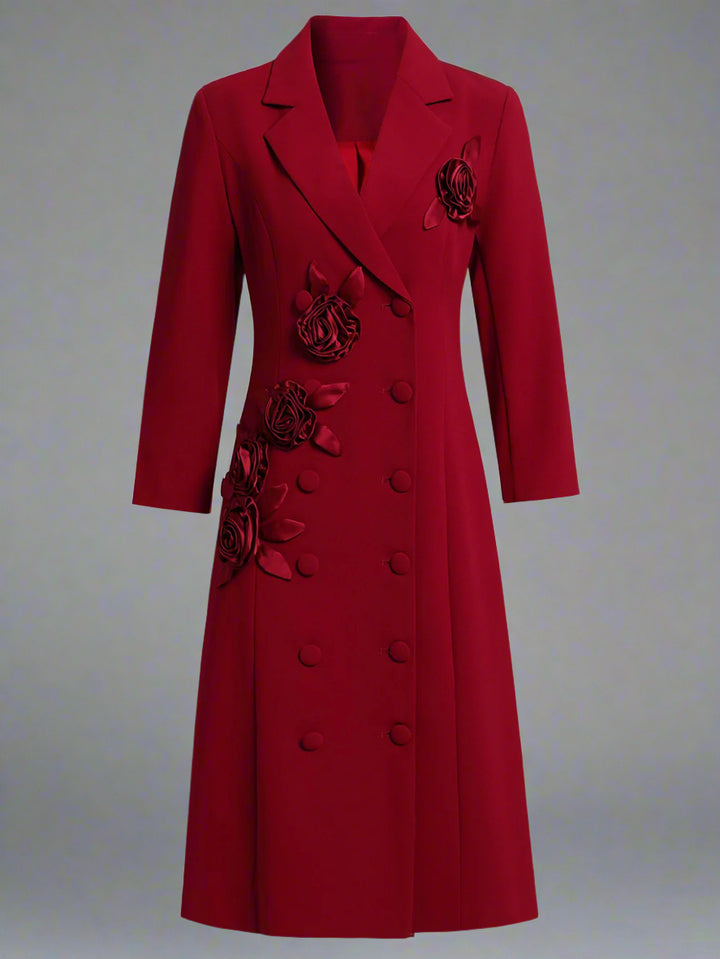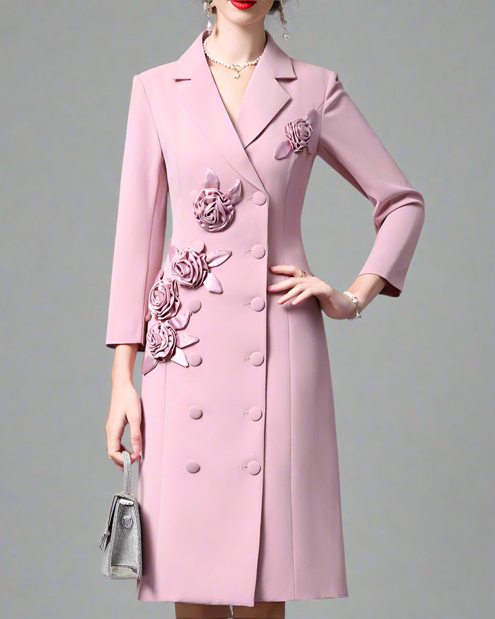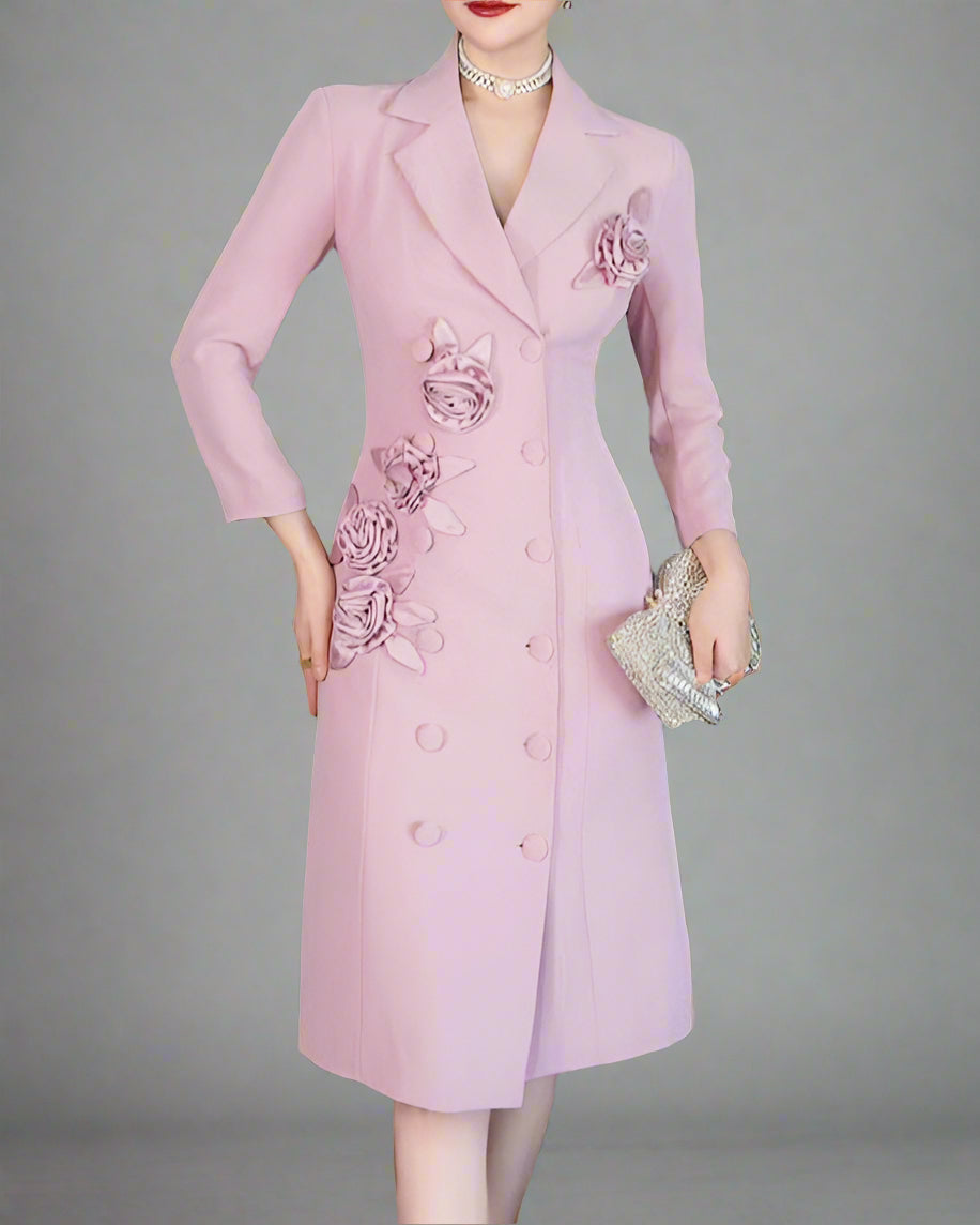 يتميز هذا الفستان الميدي الأنيق والراقي بتصميم مزدوج الصدر مع رقبة دائرية أنيقة وتطريزات زهور ثلاثية الأبعاد لامعة تمتد من الكتف إلى الحافة. يُضفي الخصر الضيق والأكمام الطويلة سحرًا خالدًا، مما يجعله خيارًا مثاليًا.