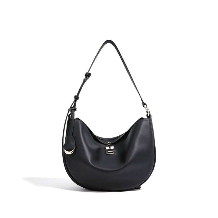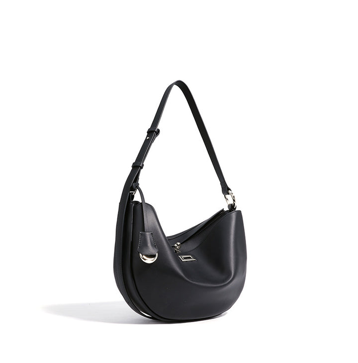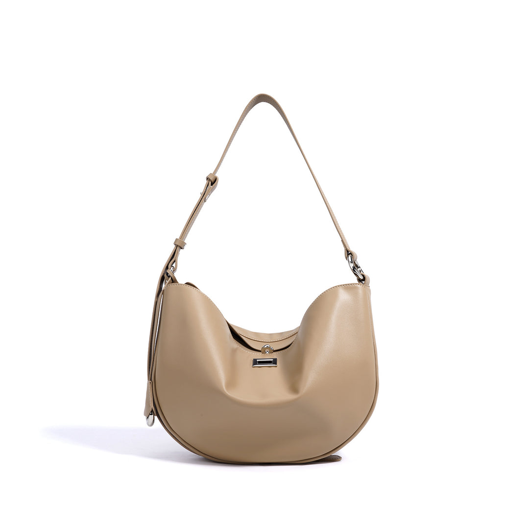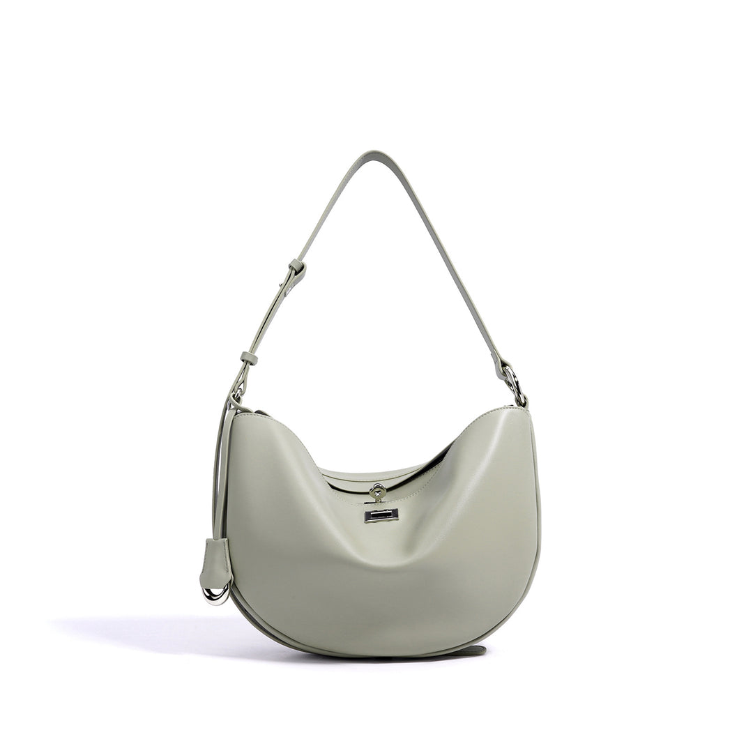 حقيبة كتف أنيقة ومنحوتة مستوحاة من الهلال، تتميز بتصميم أنيق وقاعدة منحنية وأجزاء معدنية فضية اللون. مصممة بحزام قابل للتعديل وإبزيم أمامي بسيط.