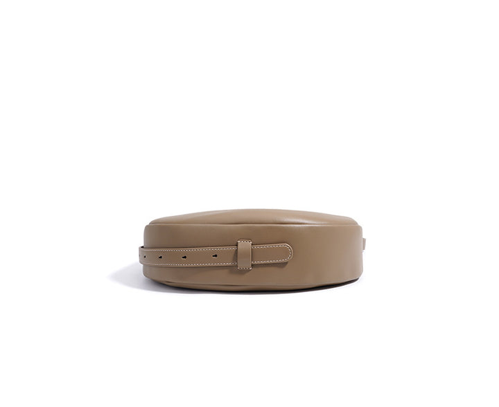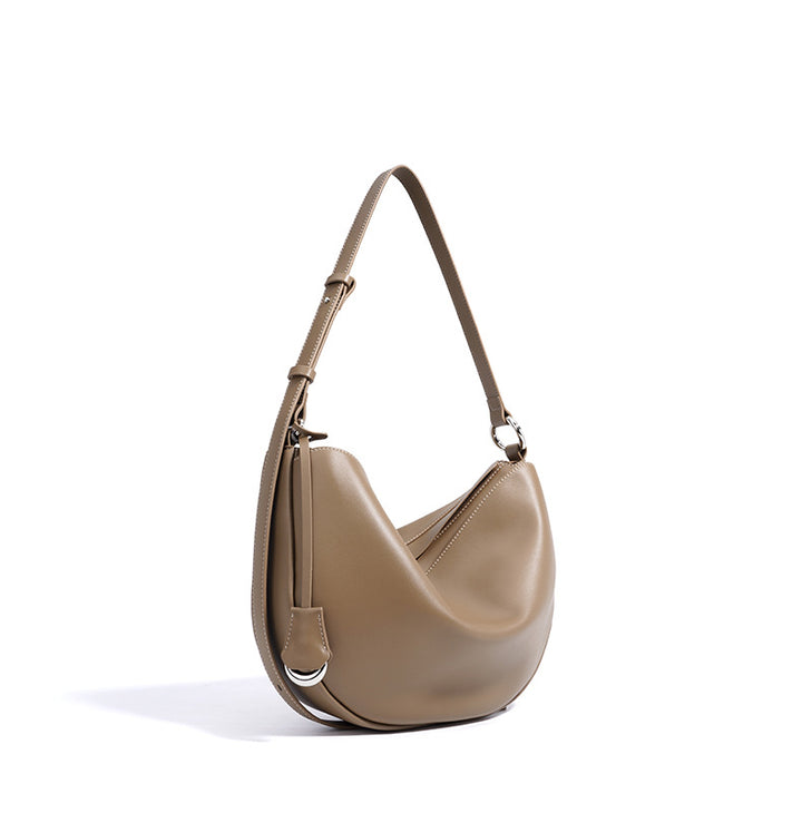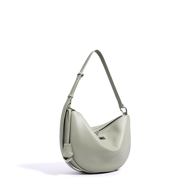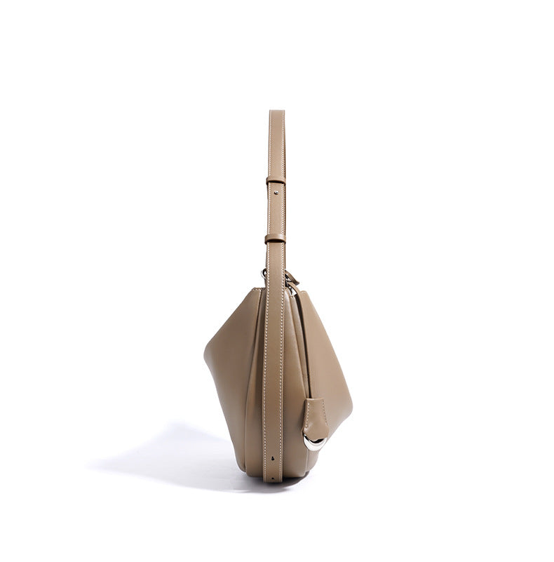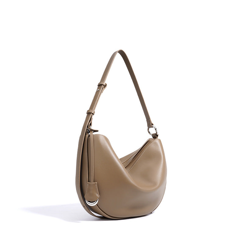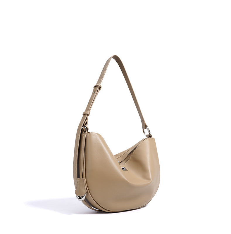 حقيبة كتف أنيقة ومنحوتة مستوحاة من الهلال، تتميز بتصميم أنيق وقاعدة منحنية وأجزاء معدنية فضية اللون. مصممة بحزام قابل للتعديل وإبزيم أمامي بسيط.
