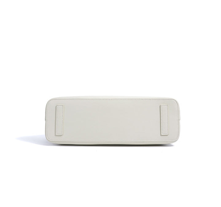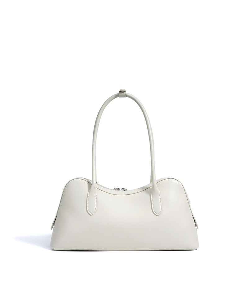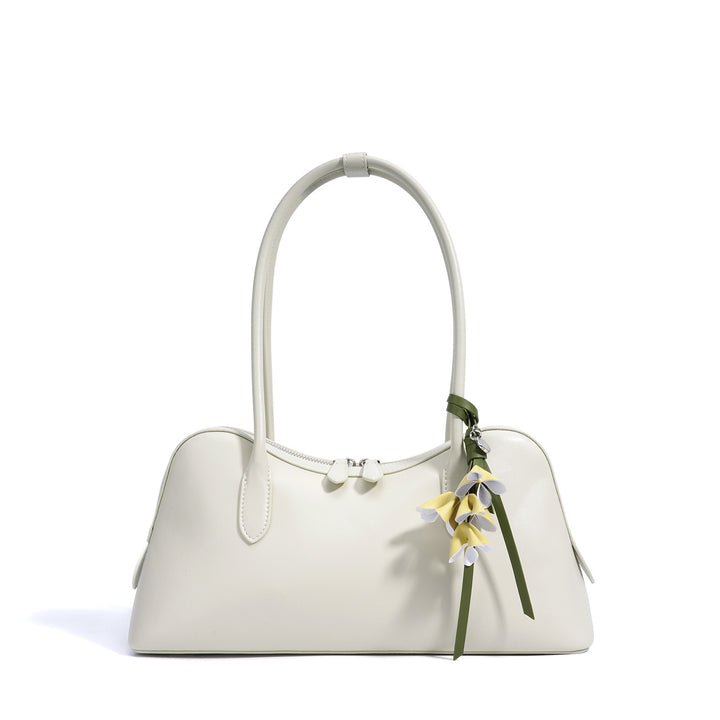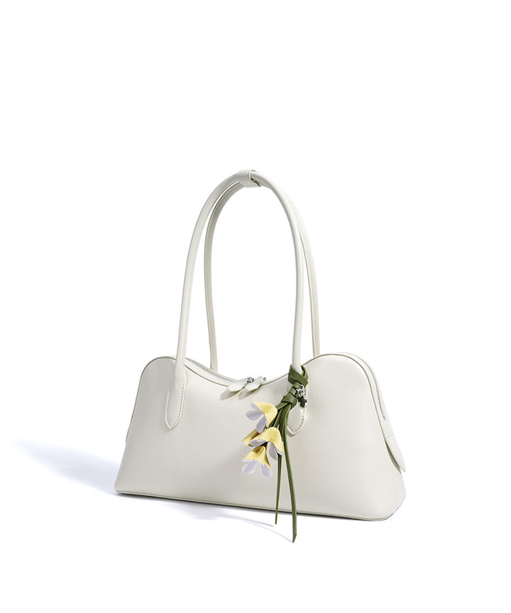 حقيبة يد أنيقة بتصميم باغيت، بلون عاجي ناعم، بمقبضين طويلين وقلادة جلدية قابلة للفصل على شكل زهرة بألوان باستيلية. أنثوية وبسيطة، مثالية لأيام الربيع والنزهات الأنيقة.