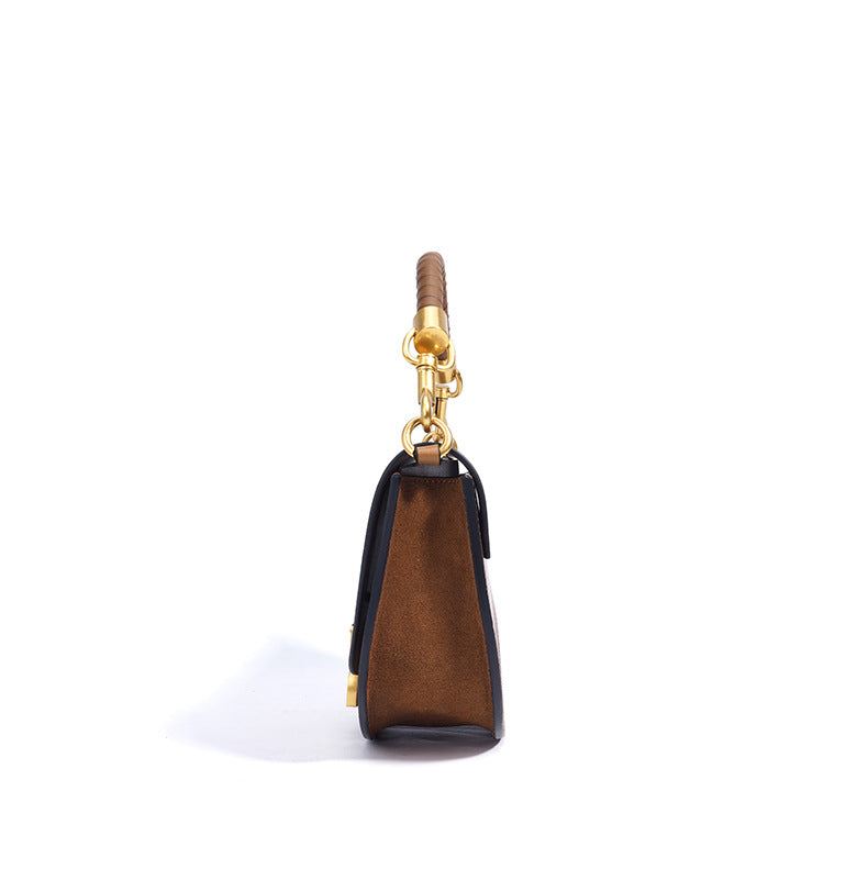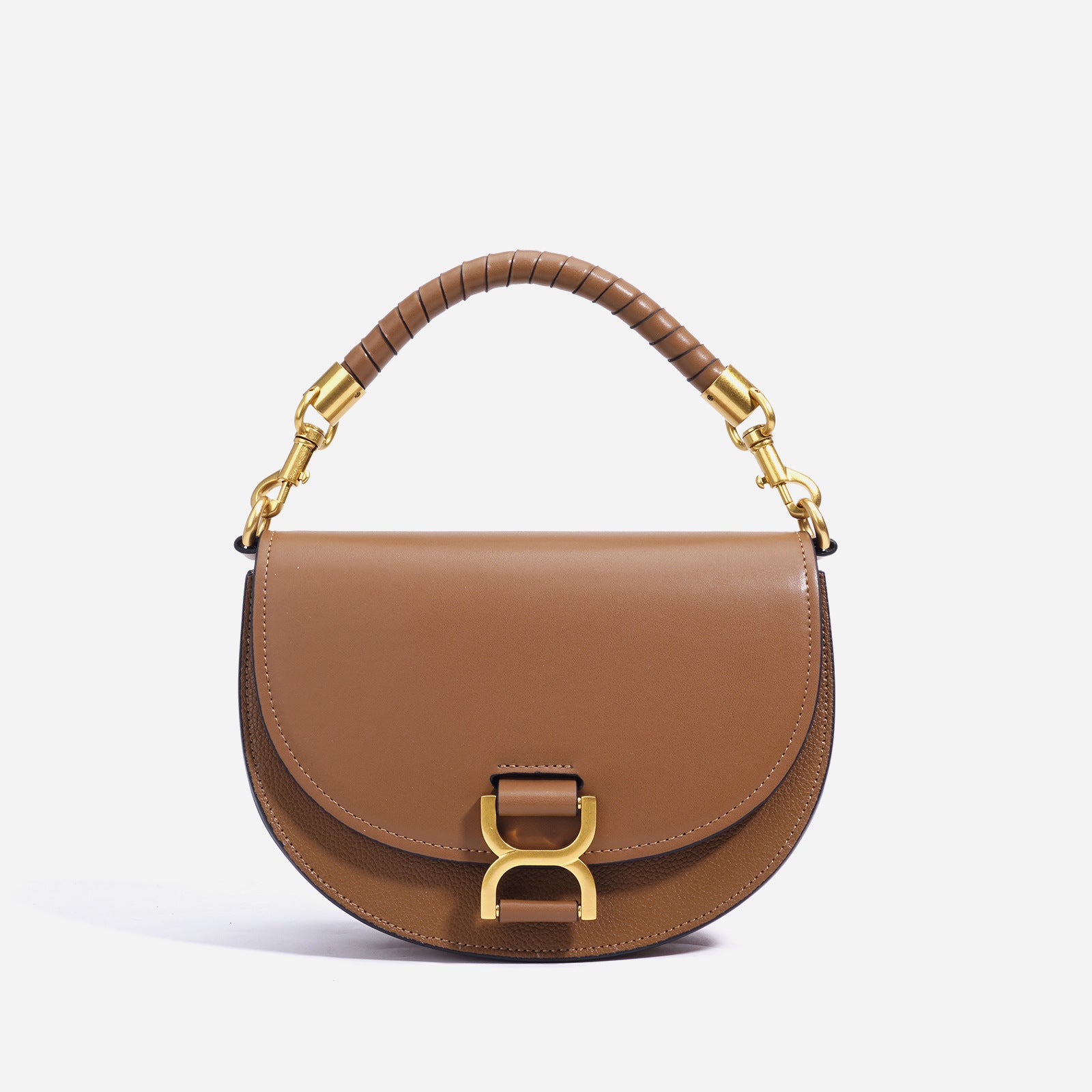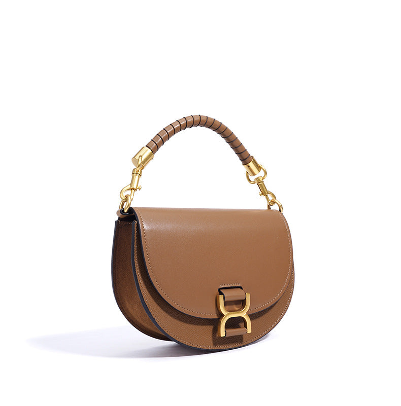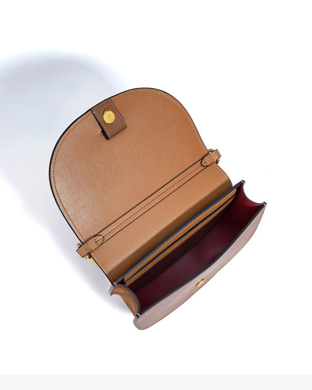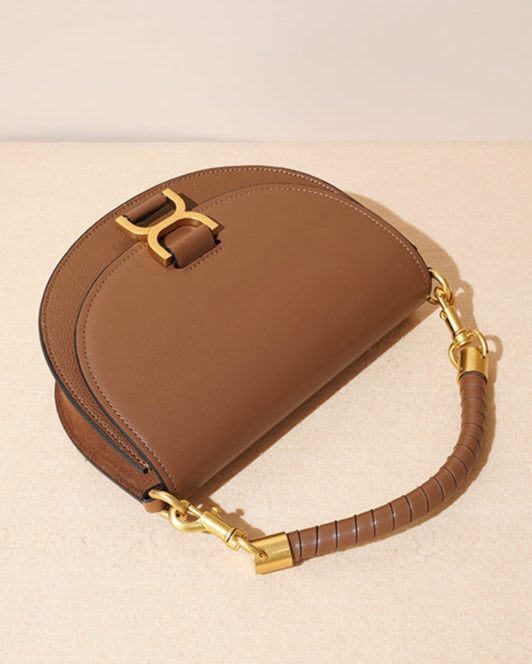 حقيبة كروس أنيقة على شكل هلال مصنوعة من جلد ناعم، وتتميز بمقبض علوي ملفوف وإبزيم ذهبي جريء. متعددة الاستخدامات.
