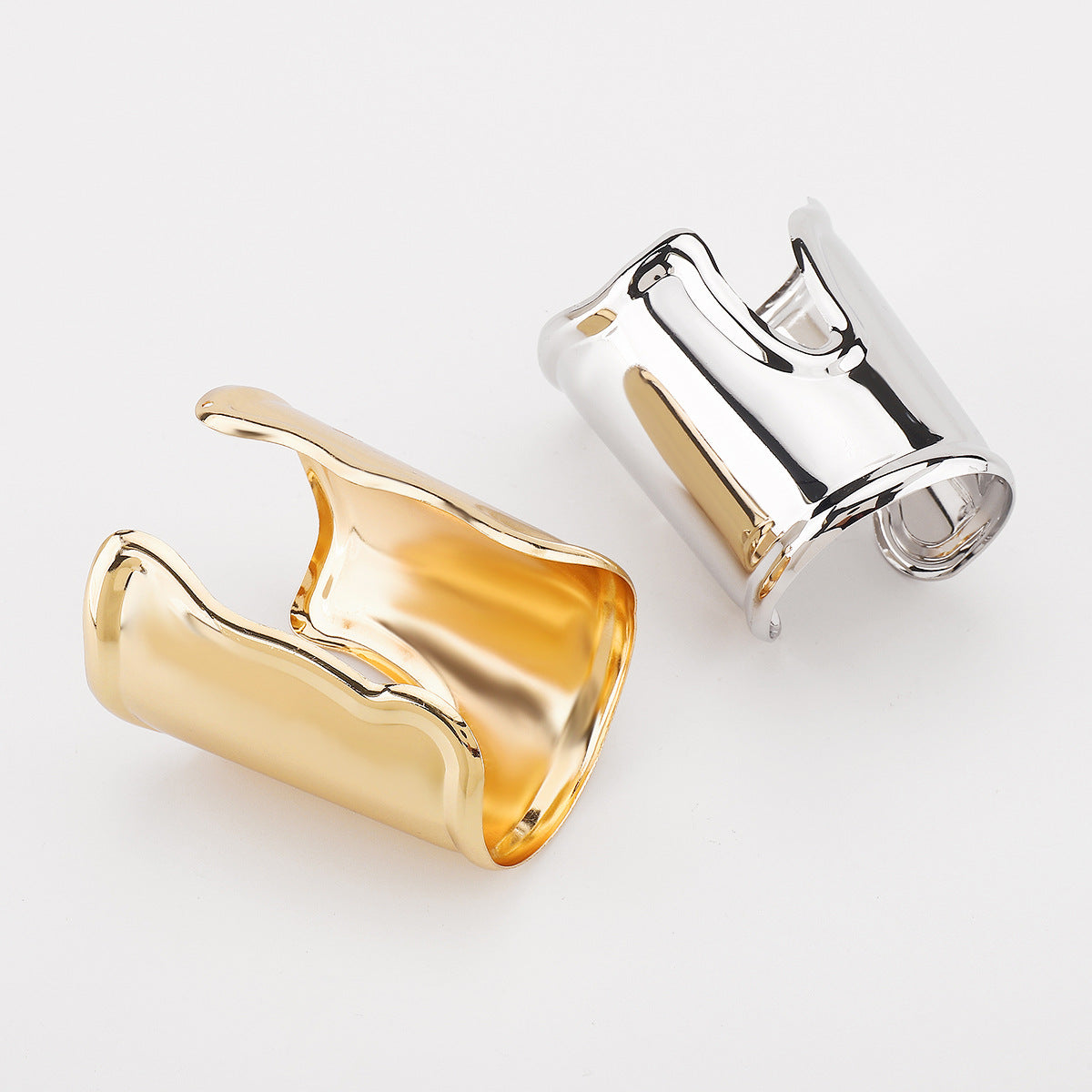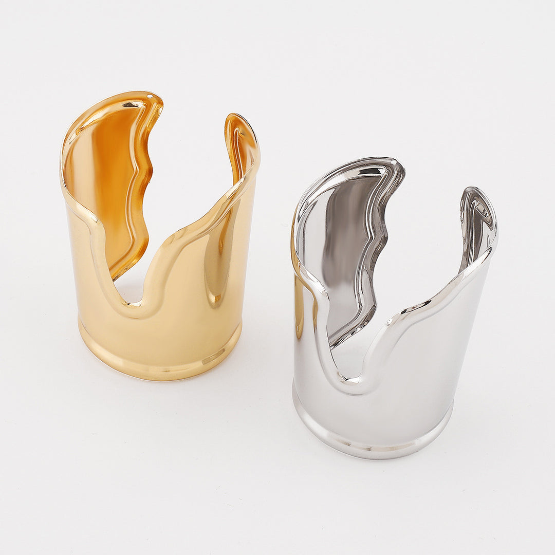 جريء ومستقبلي، يتميز هذا السوار اللامع بقصّة مموجة عميقة وتصميم انسيابي. مصنوع من الذهب والفضة، إنه قطعة مميزة تُحيط معصمك بأناقة عصرية.