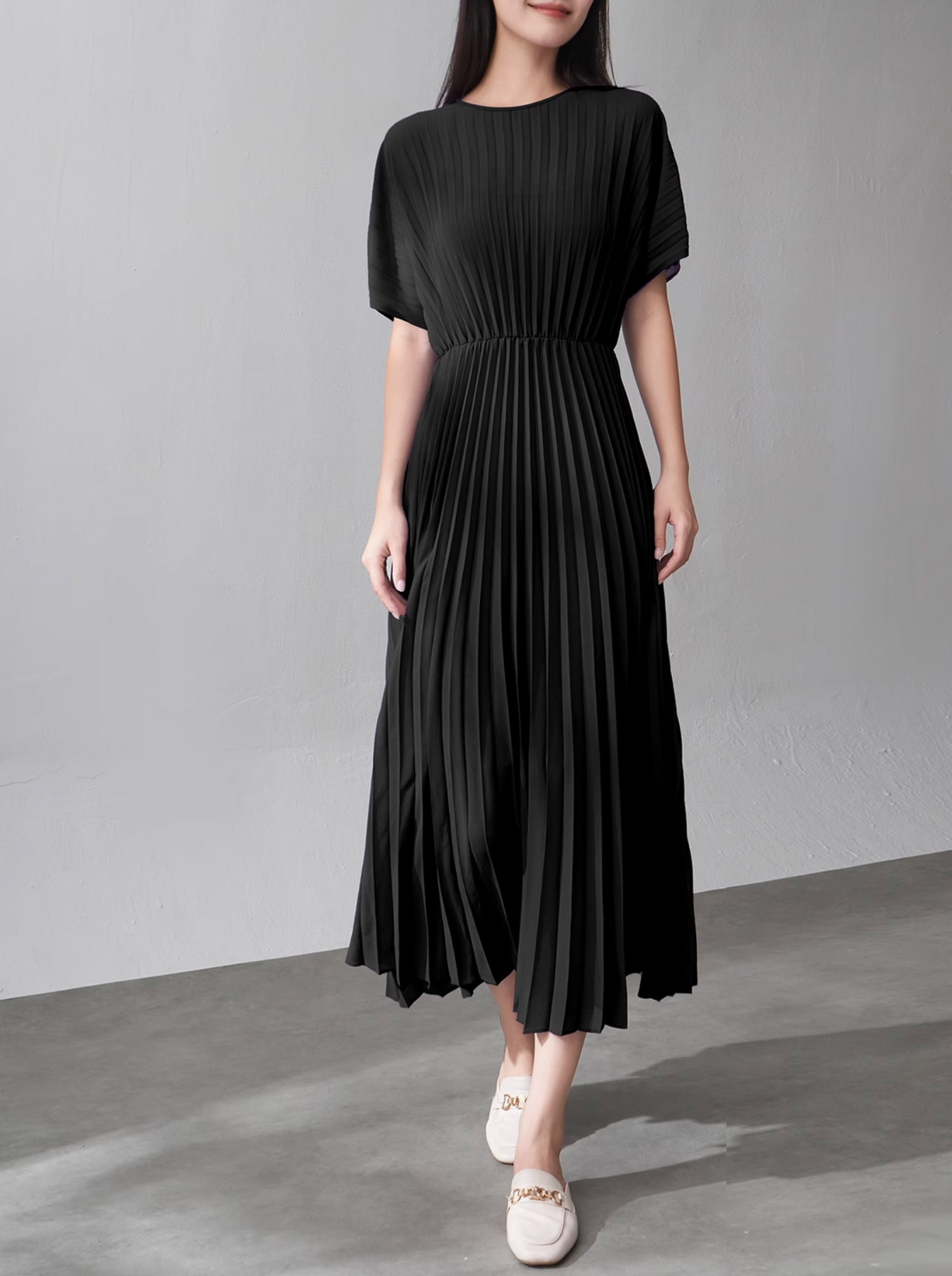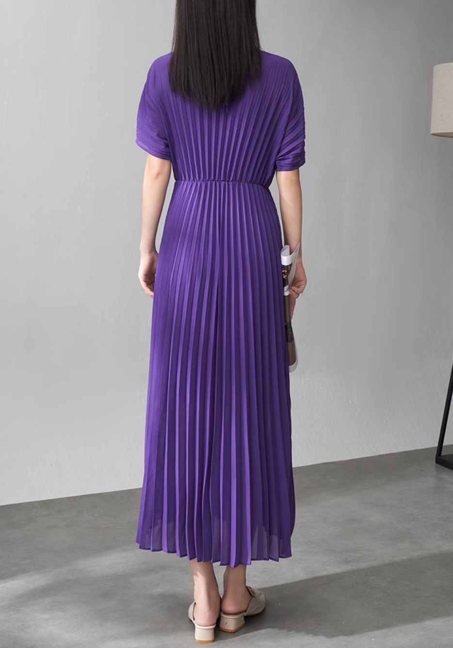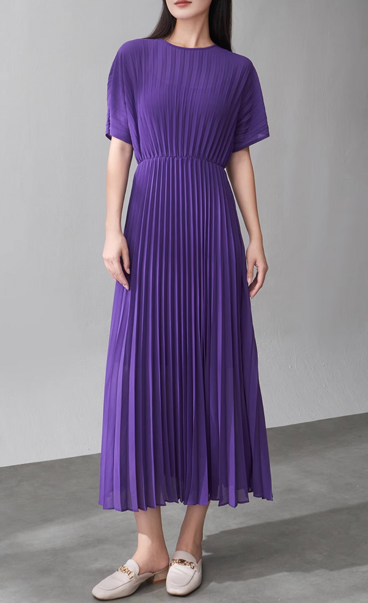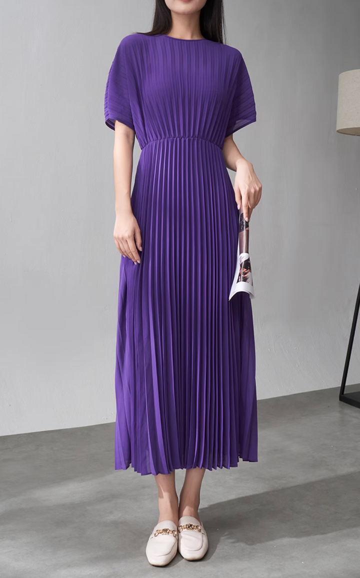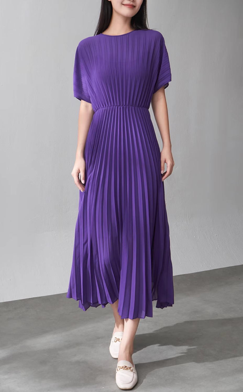 فستان ميدي بنفسجي غني، أنيق وخالد، يتميز بثنيات ناعمة في كل مكان وأكمام قصيرة مريحة. أنيق بكل معنى الكلمة، مثالي للمناسبات النهارية والمسائية.