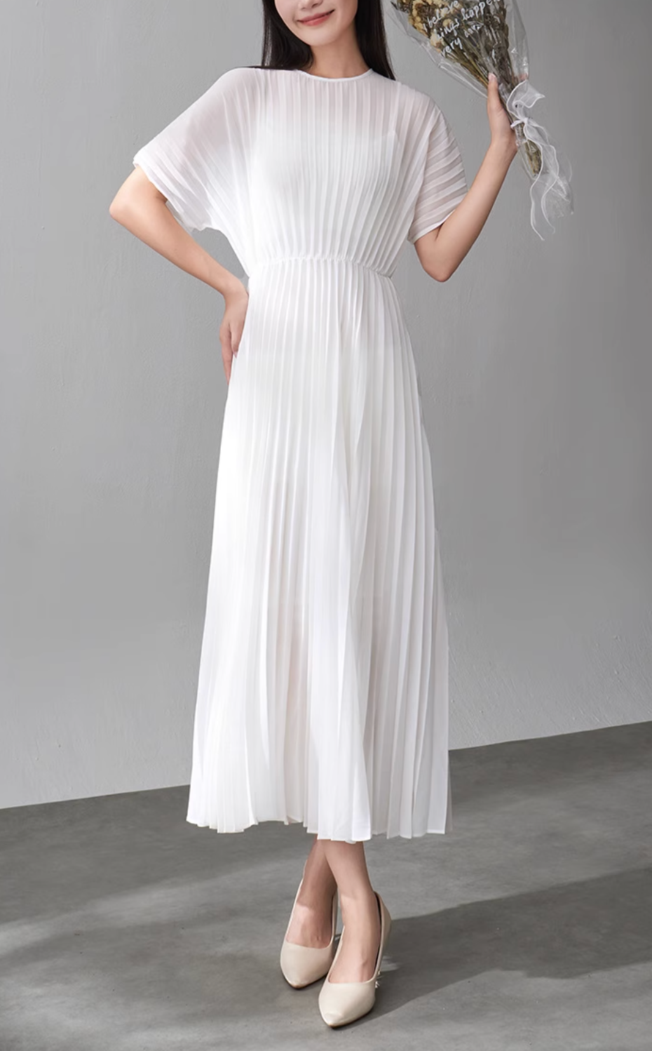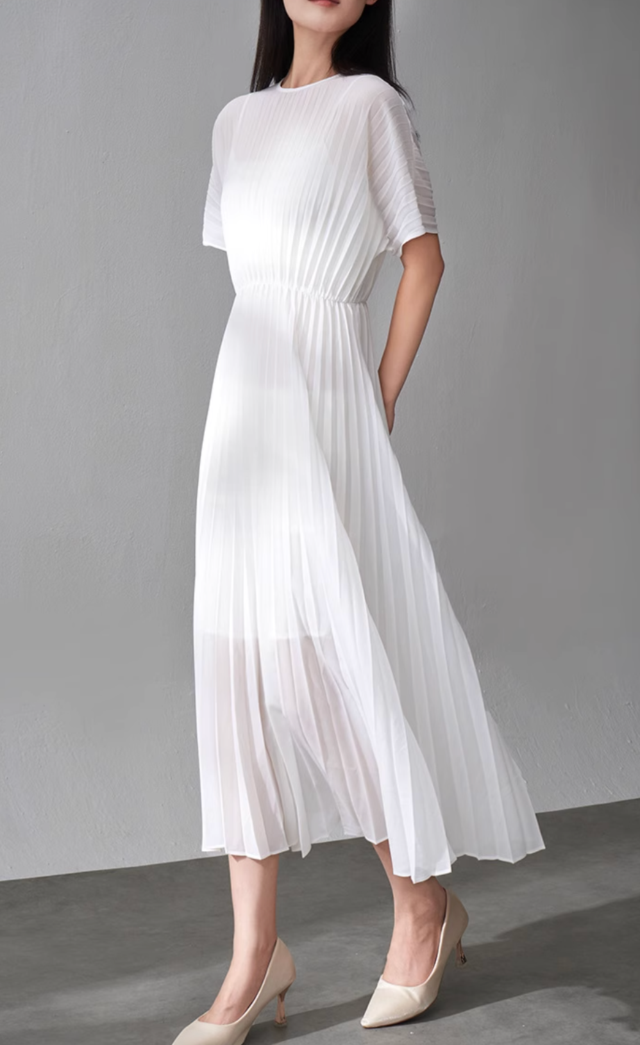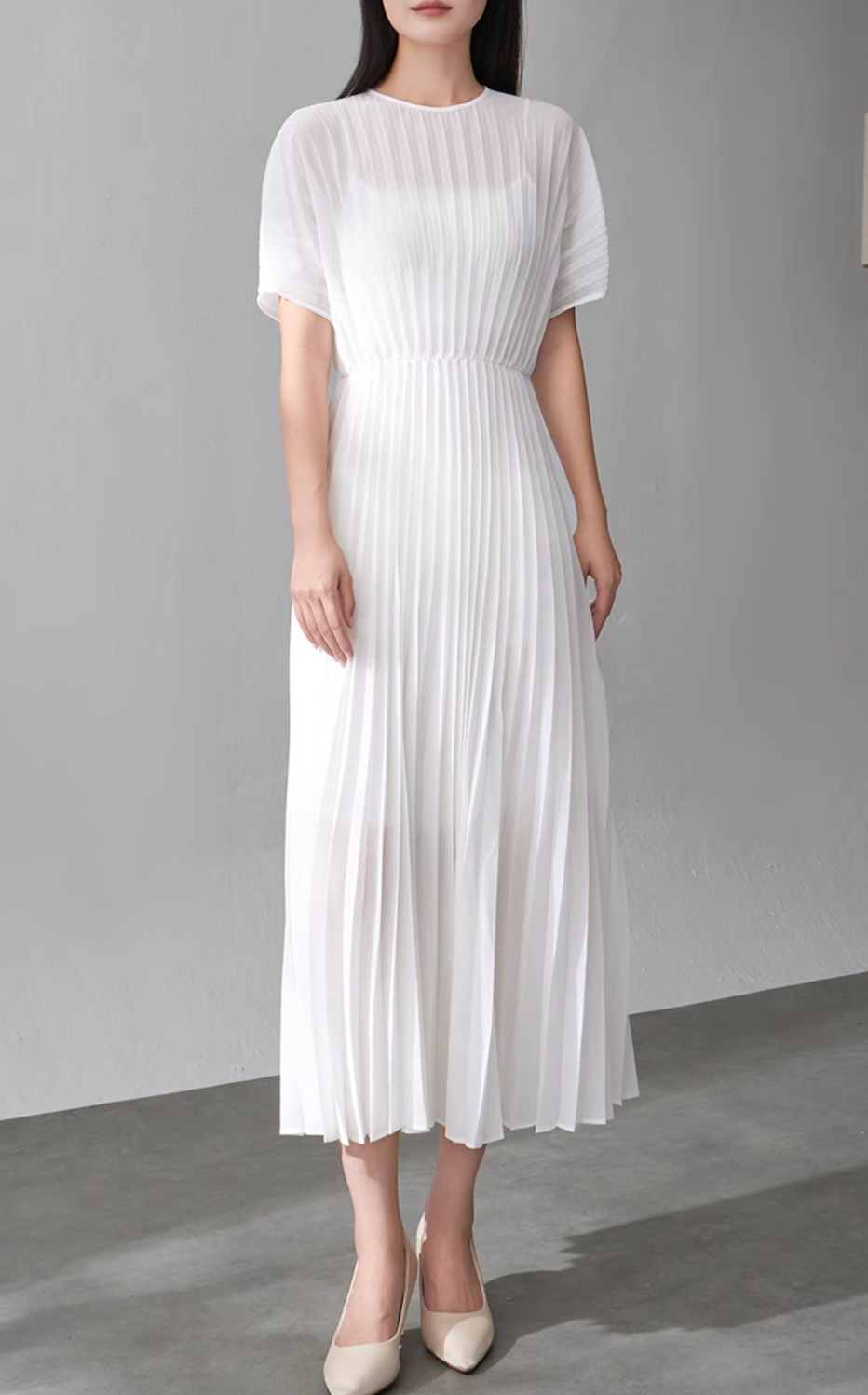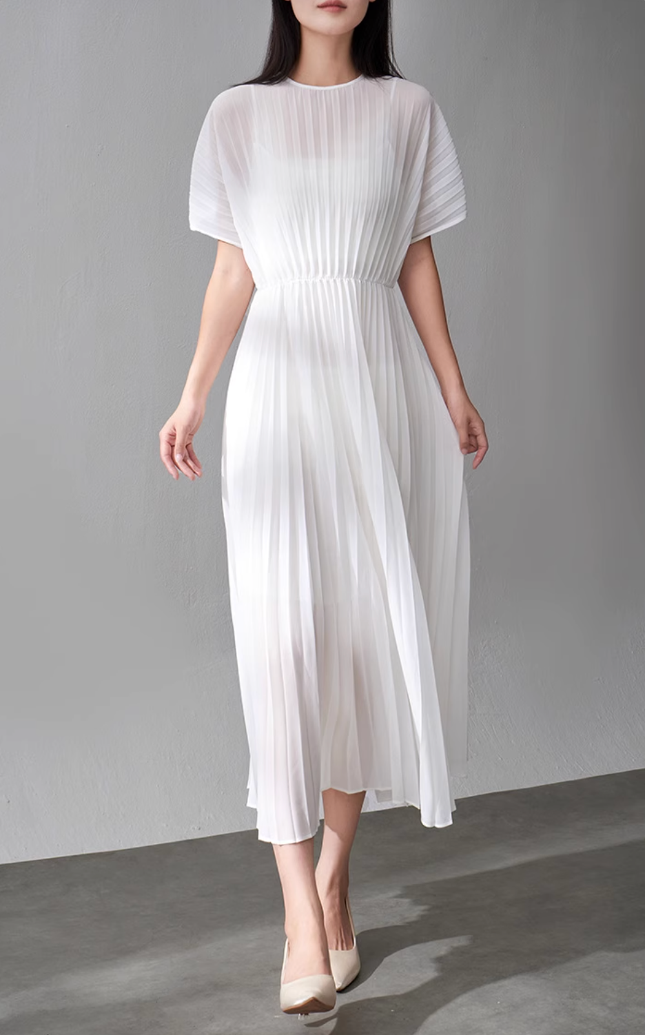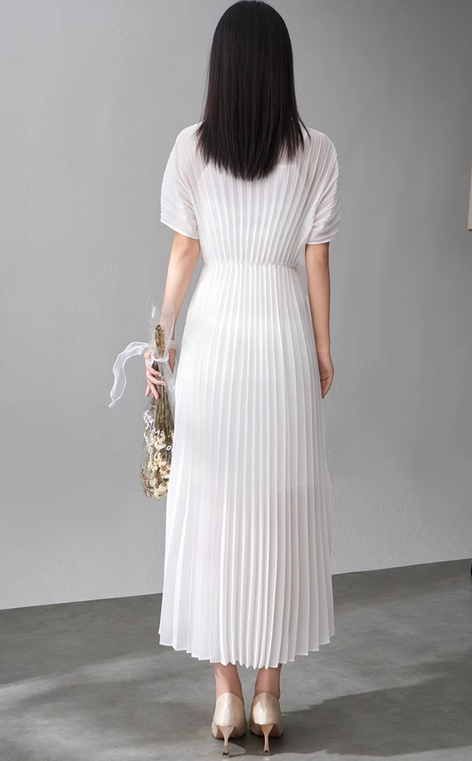 فستان ميدي بنفسجي غني، أنيق وخالد، يتميز بثنيات ناعمة في كل مكان وأكمام قصيرة مريحة. أنيق بكل معنى الكلمة، مثالي للمناسبات النهارية والمسائية.