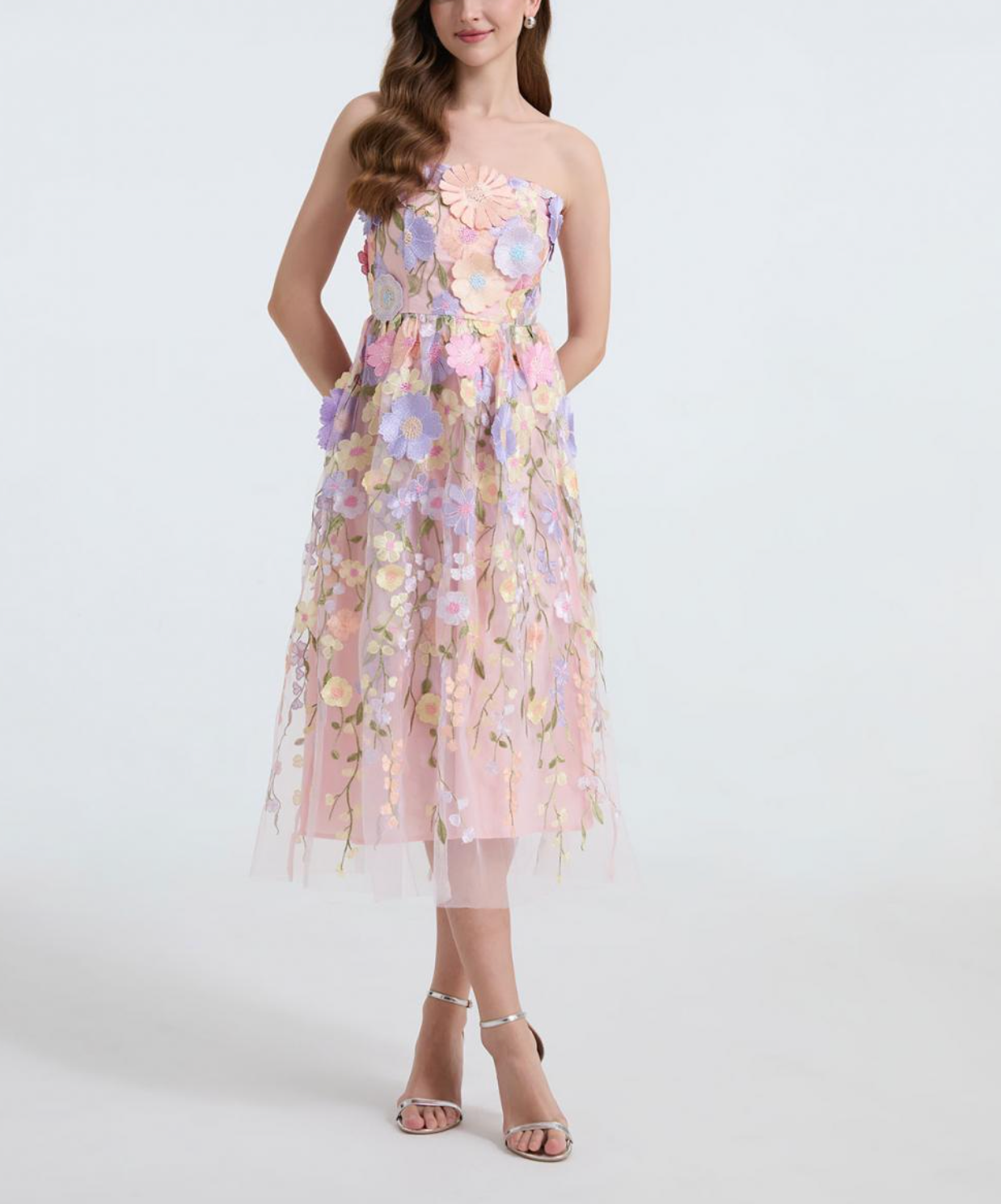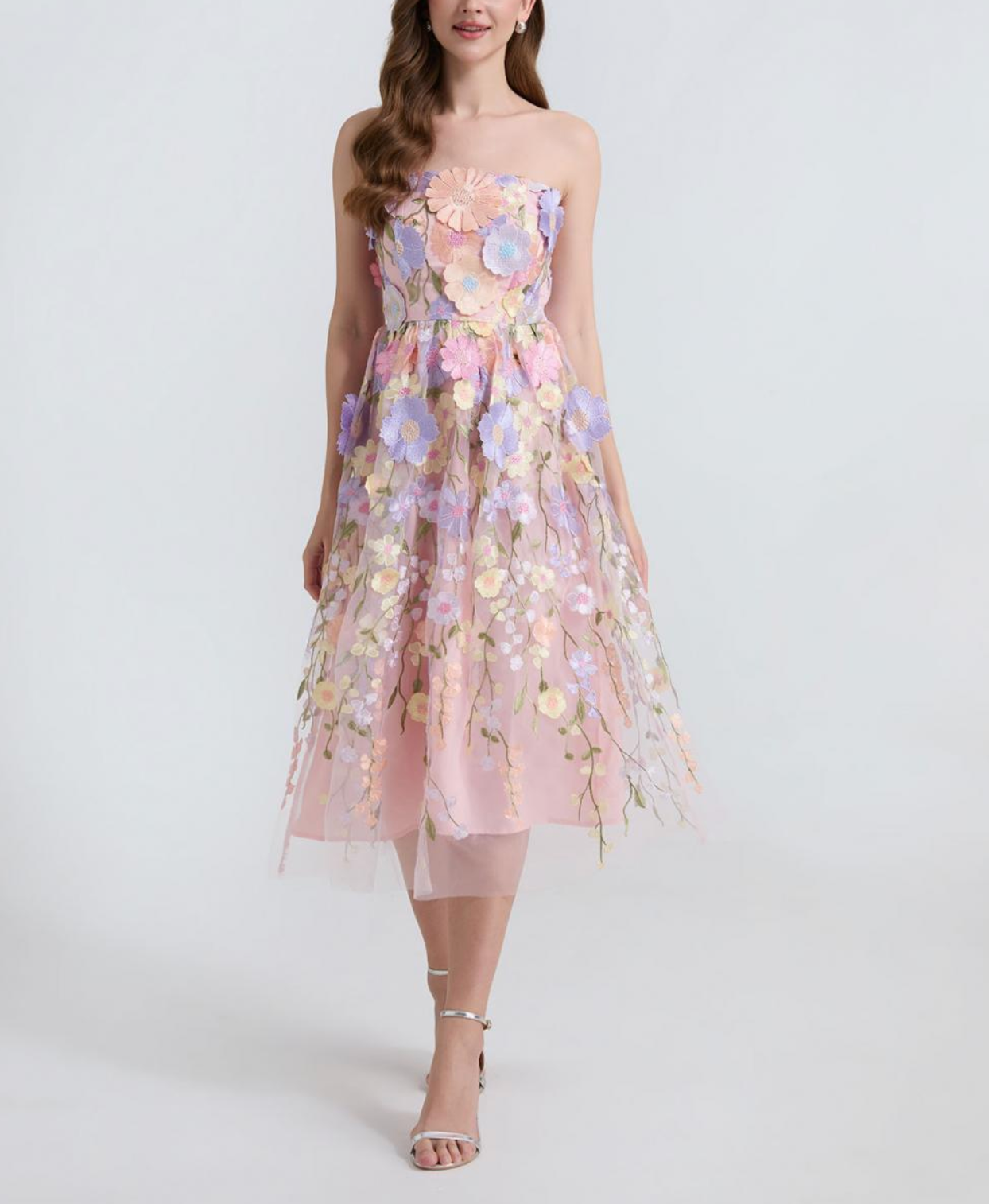 فستان ميدي رومانسي وردي فاتح بدون حمالات، مزين بزخارف زهور ثلاثية الأبعاد نابضة بالحياة وتطريز رقيق على شكل كرمة. يُضفي التول ذو الطبقات الواسعة لمسةً حالمة، مثالية لحفلات الحديقة أو أمسيات الربيع.