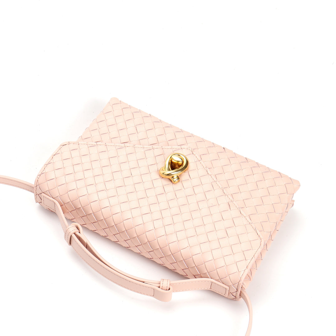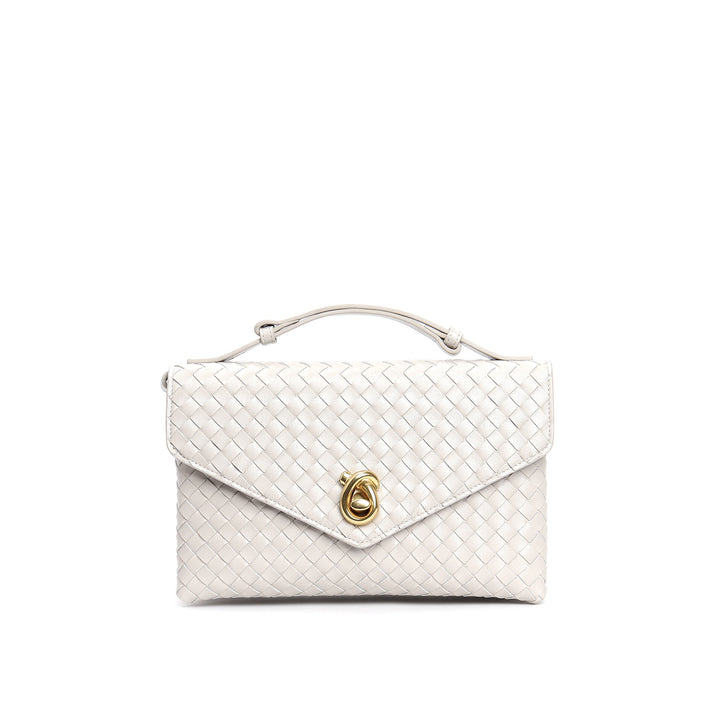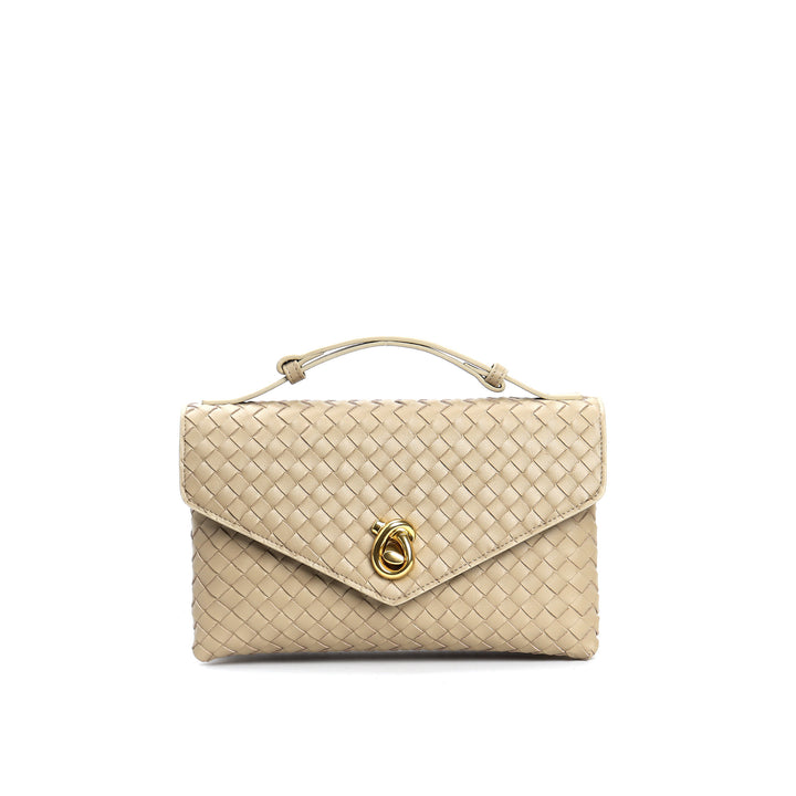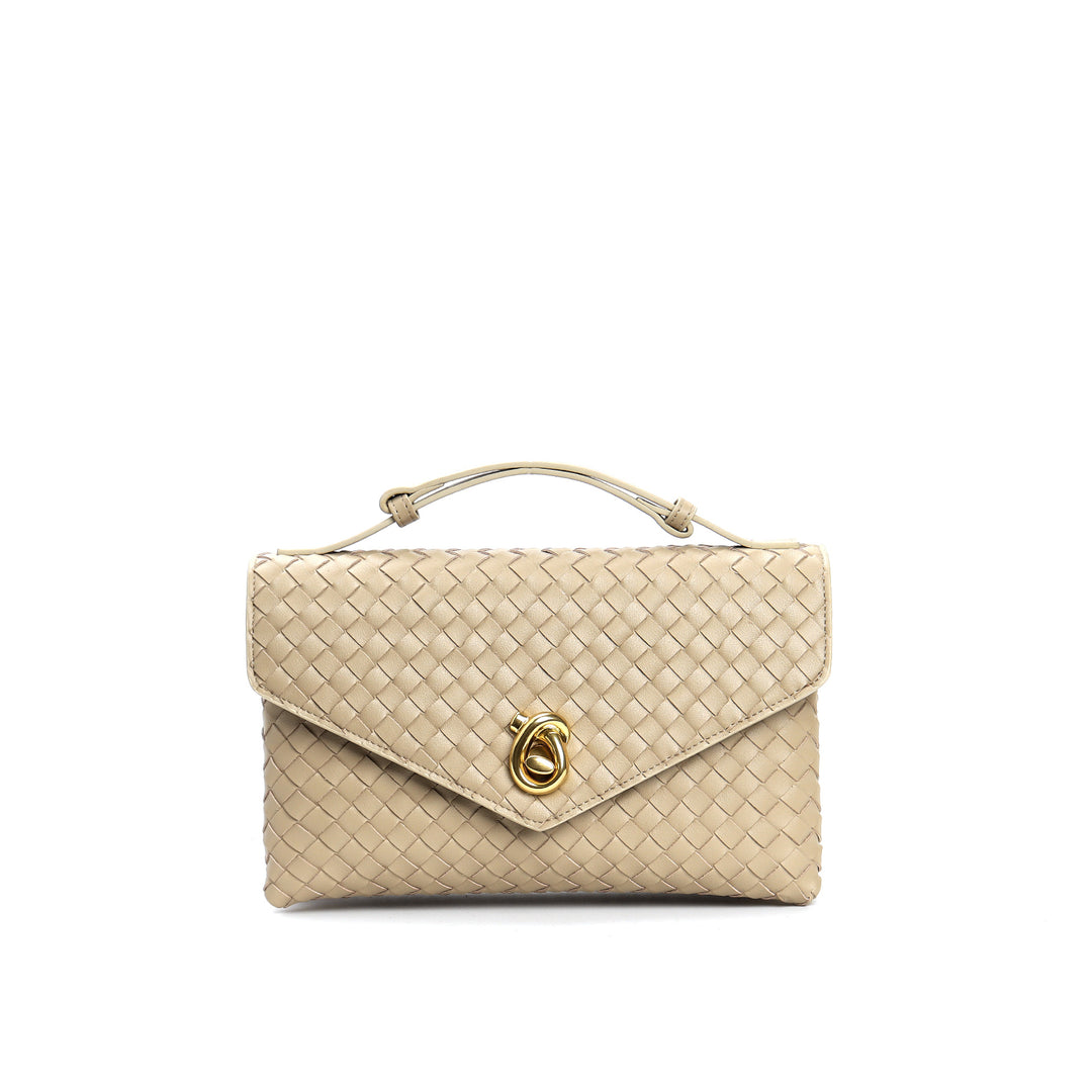 هذه الحقيبة الصغيرة ذات المقبض العلوي مصنوعة من جلد منسوج بدقة، وتتميز بغطاء أنيق على شكل مظروف مع قفل ذهبي اللون. أنيقة ومتعددة الاستخدامات، بفضل حزامها المتقاطع القابل للتعديل وتصميمها الأنيق.