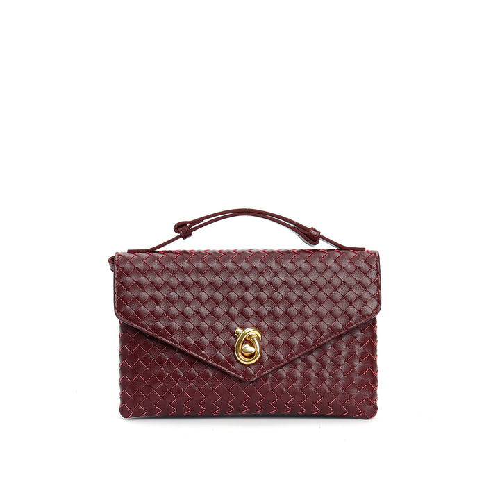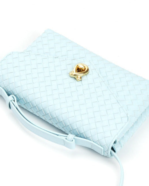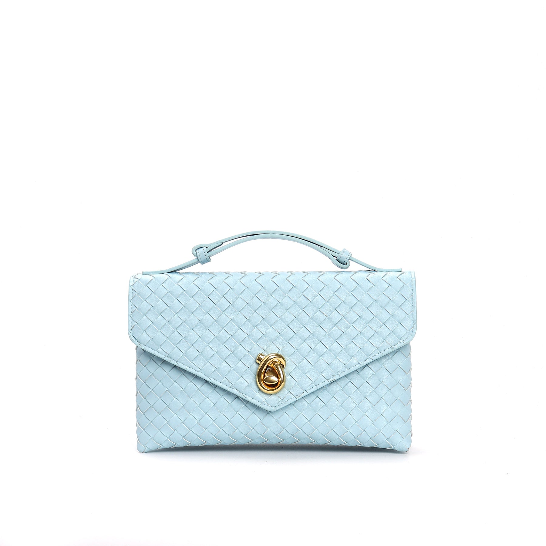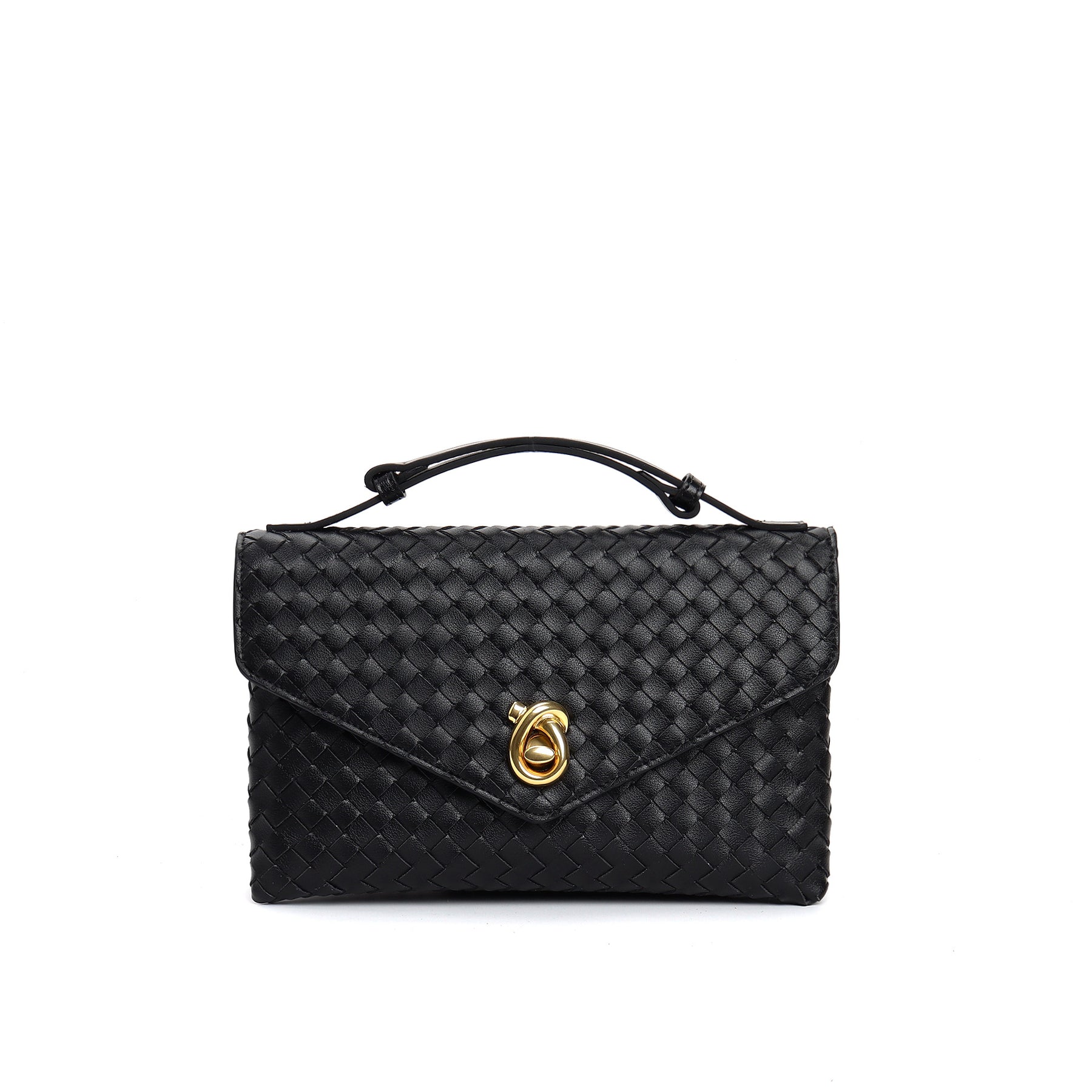 هذه الحقيبة الصغيرة ذات المقبض العلوي مصنوعة من جلد منسوج بدقة، وتتميز بغطاء أنيق على شكل مظروف مع قفل ذهبي اللون. أنيقة ومتعددة الاستخدامات، بفضل حزامها المتقاطع القابل للتعديل وتصميمها الأنيق.