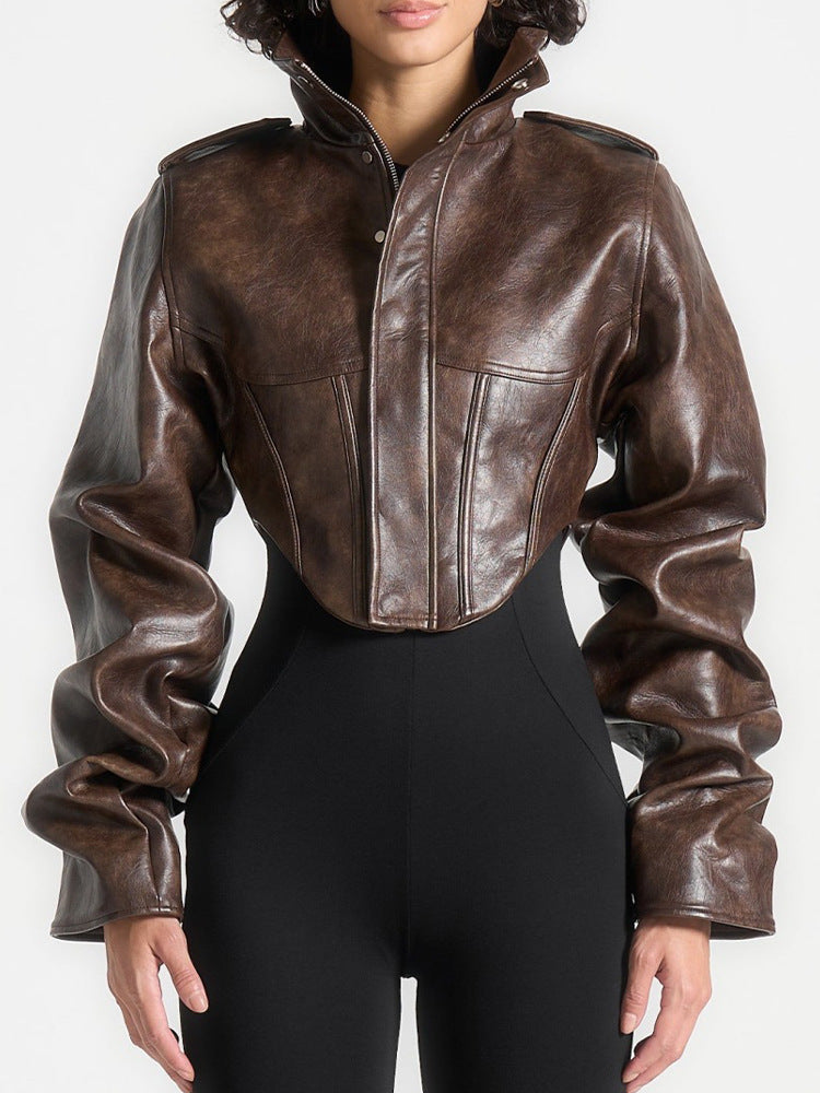 A short, classic-inspired leather jacket in a muted brown color, featuring a defined high collar, prominent stitching, and ruffled sleeves. Perfect for adding a modern and edgy touch. Fabric name: cotton Size Shoulder (cm) Bust (cm) Length (cm) S 42 99 48 M 43 103 49 L 44 107 50