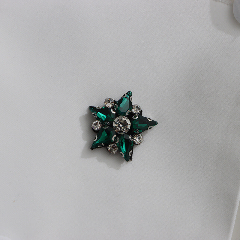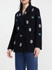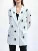 A statement double-breasted blazer adorned with crystal and emerald-style embellishments, blending luxury detailing with sharp tailoring for a dazzling modern look.