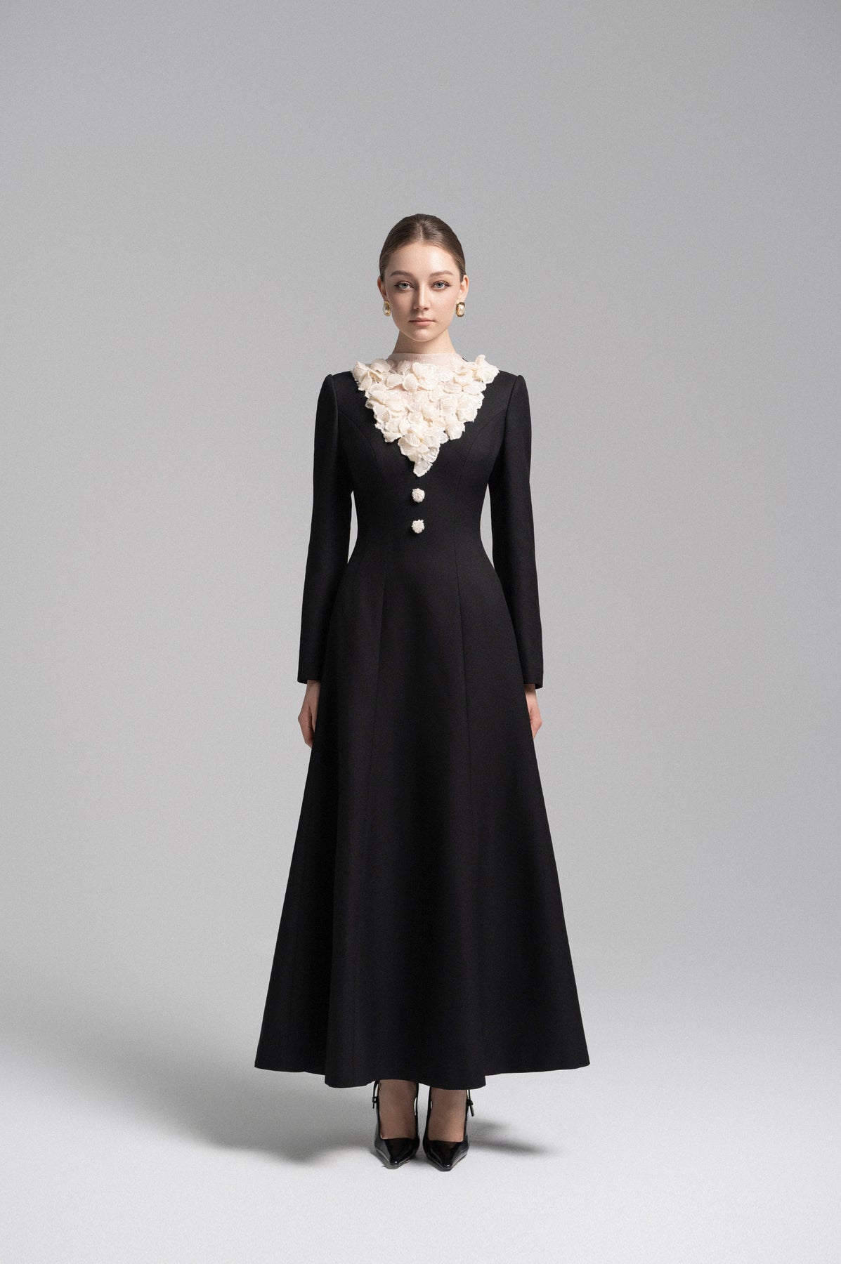 An elegant black A-line dress adorned with a dramatic ivory ruffled lace neckline and statement front buttons. Its structured silhouette and refined detailing evoke vintage charm with a touch of royal sophistication—ideal for formal soirées or refined gatherings.