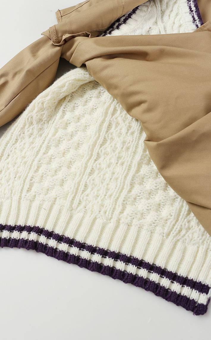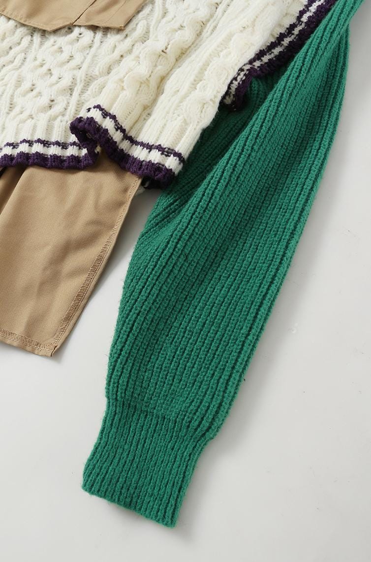 A creative blend of a cable-knit sweater and a classic shirt, this sweater features contrasting green sleeves and an asymmetrical cut. It's finished with a practical pocket for a modern, deconstructed look.