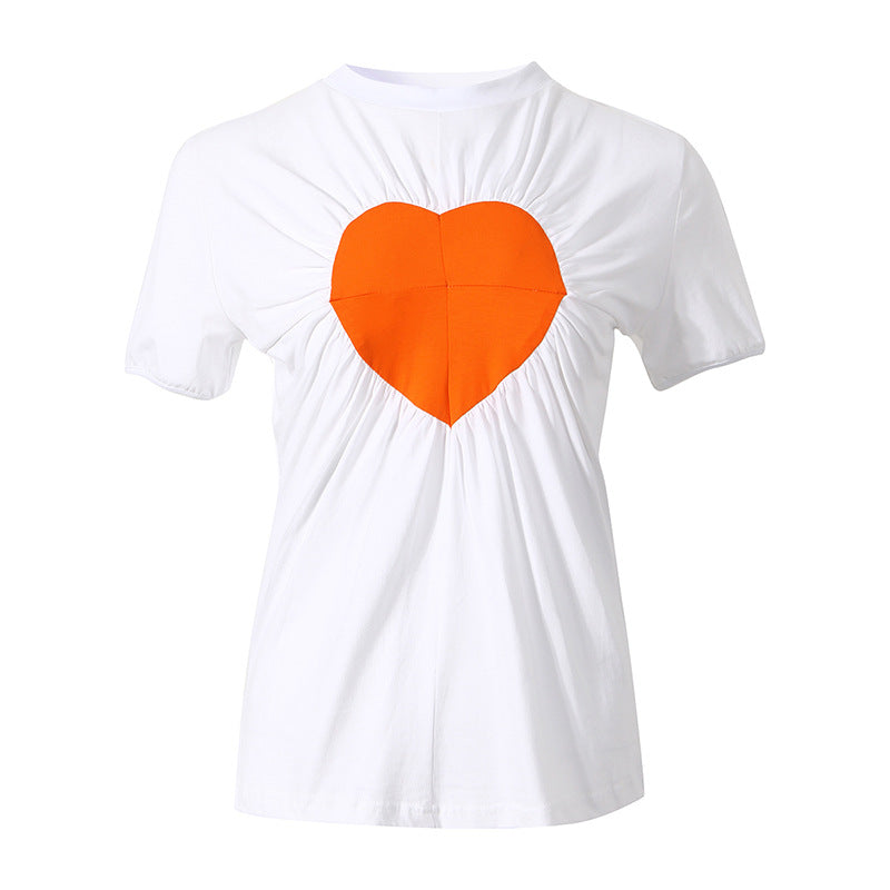 short-sleeve ruched T-shirt with heart patch & belted bib shorts - AMORKA