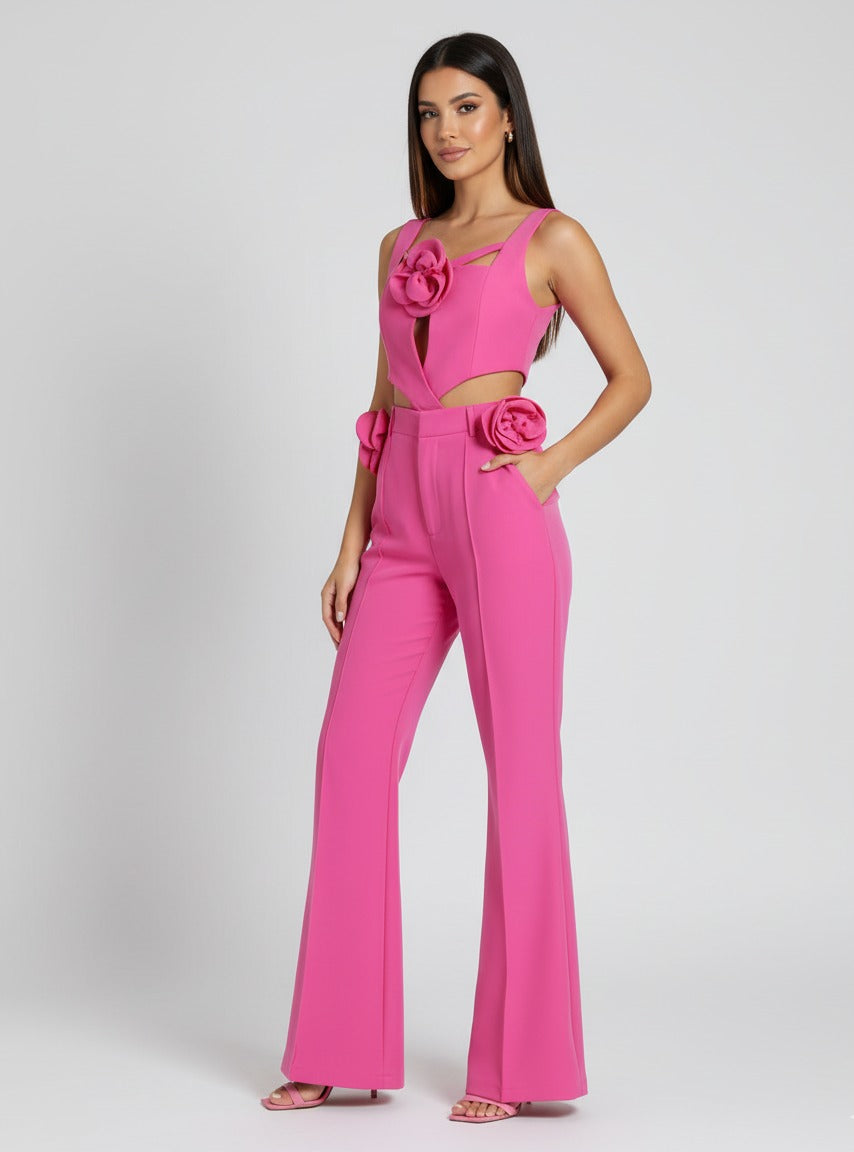 Make a bold statement with this sleeveless jumpsuit, featuring eye-catching floral embroidery, an open bodice, and high-waisted wide-leg pants. Designed for a chic, modern look with a playful twist.