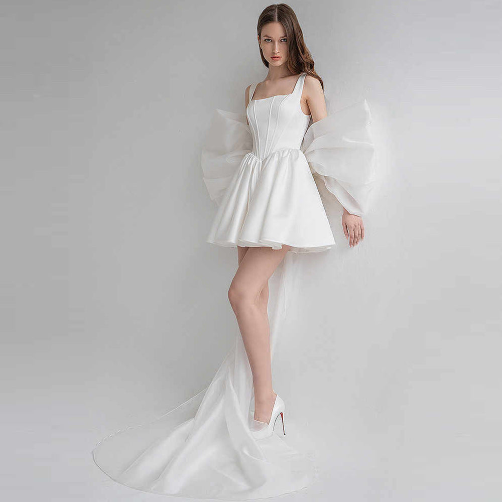 A short, sleeveless dress with a distinctive design, featuring an elegant bodice, attractive puffy sleeves, and a long, flowing train for a charming, modern look.
