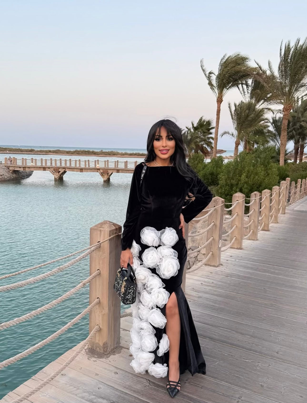 Elegant black velvet gown featuring a sleek off-shoulder neckline and dramatic cascade of oversized white floral appliqués down the front, creating a striking monochrome contrast for high-fashion evenings.