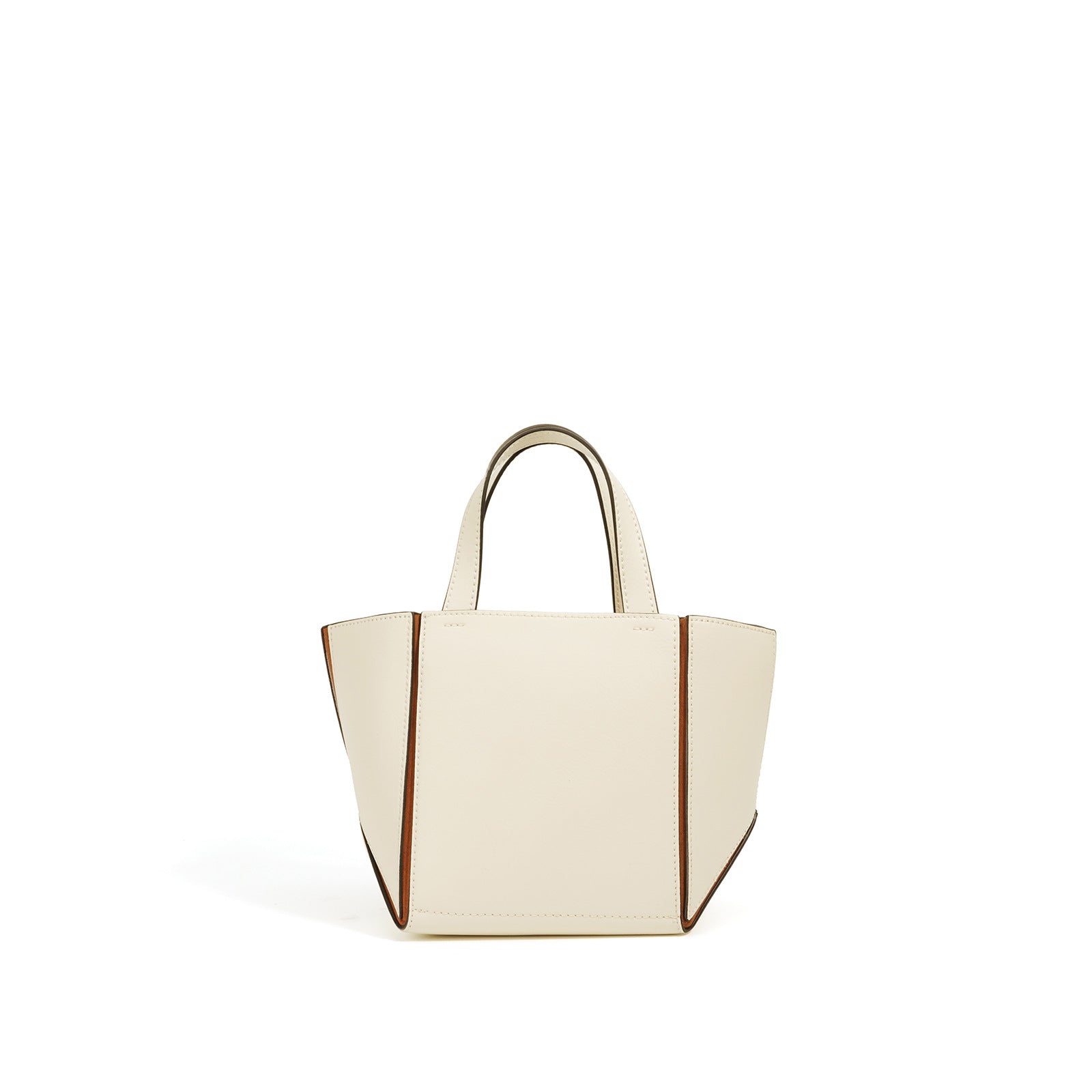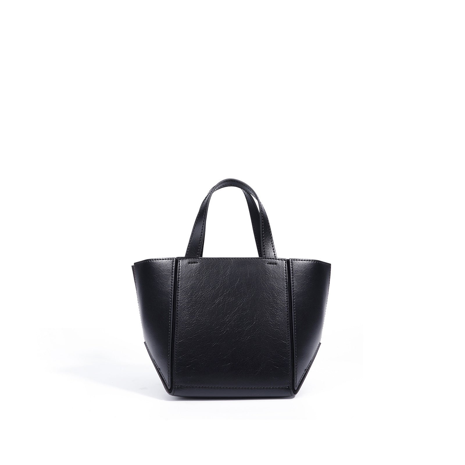 An elegant tote bag crafted from smooth leather, featuring wide side panels and sharp corners. Featuring sturdy top handles and a simple design, this bag combines style and functionality.