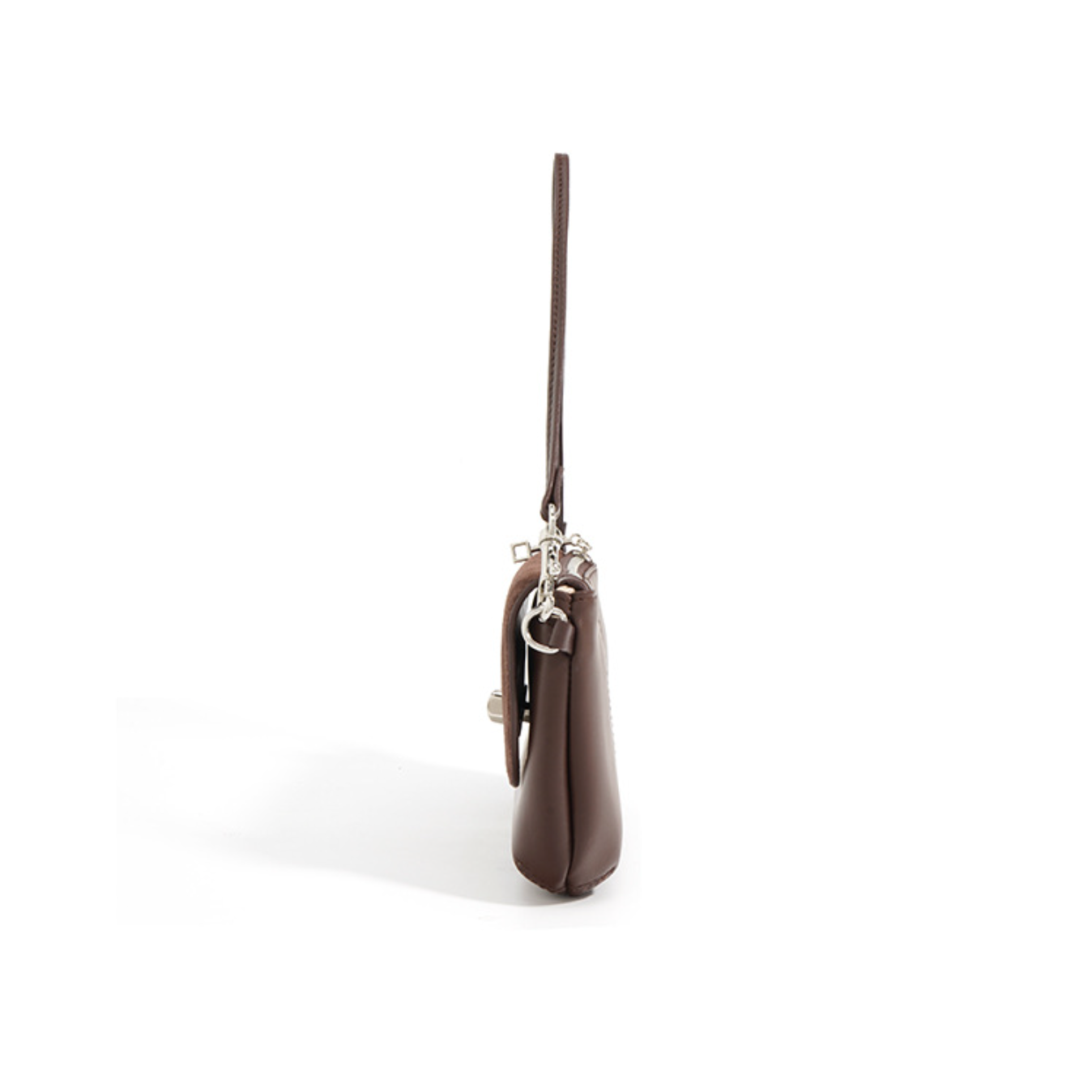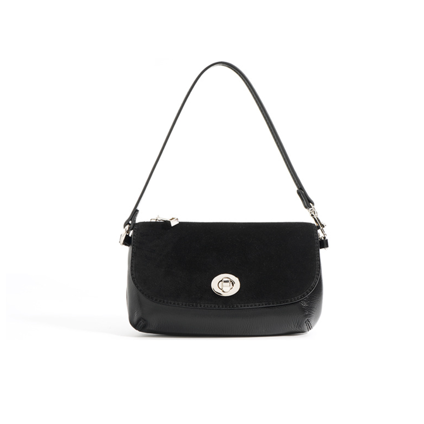 Chic and compact chocolate brown shoulder bag combining soft suede and smooth leather textures, finished with a sleek silver twist-lock closure for timeless elegance.