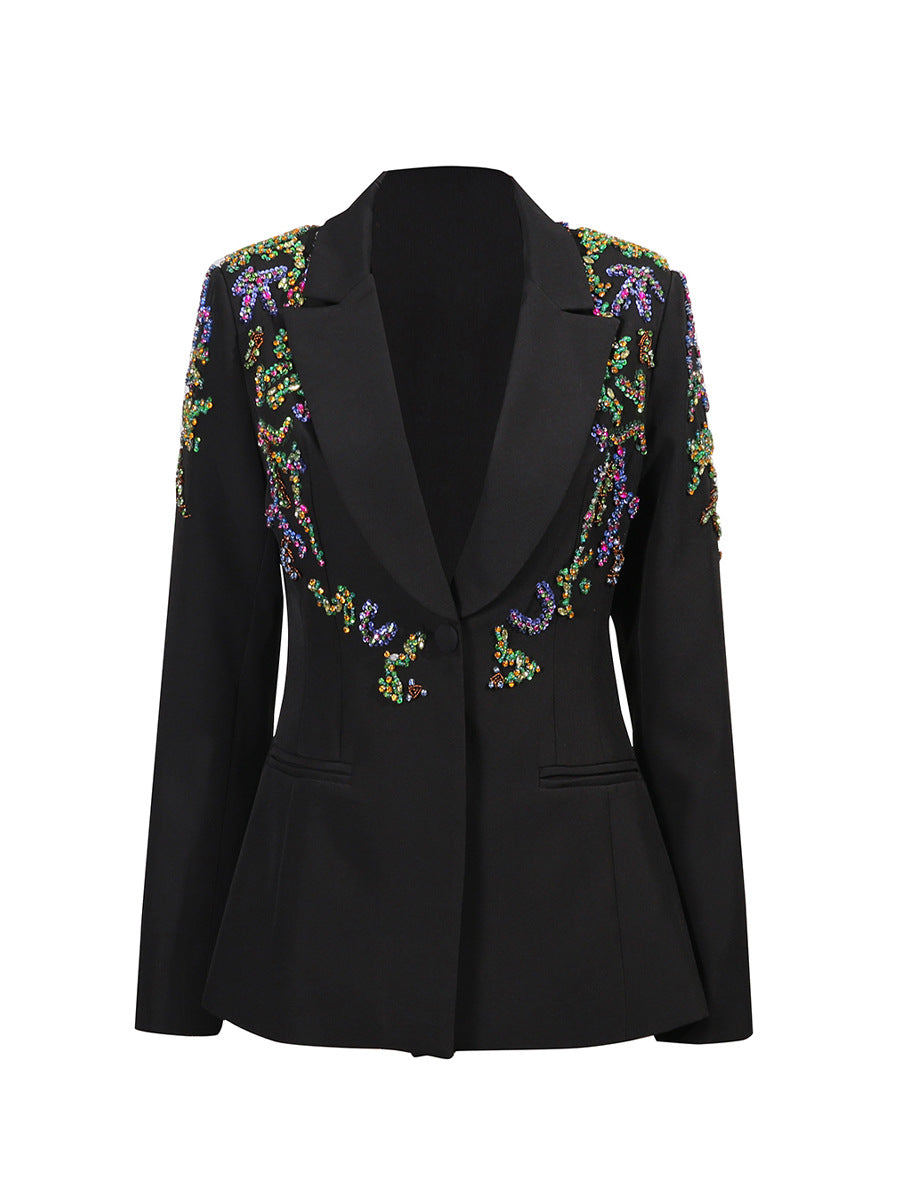 An elegant black jacket adorned with sparkling crystal embroidery on the shoulders and collar. A luxurious and distinctive piece that combines classic design with a sophisticated artistic touch. Fabric name: polyester and cotton Size Shoulder (cm) Bust (cm) Waist (cm) Sleeve (cm) Length (cm) S 39 94 72 59 68 M 40 98 76 60 69 L 41 102 80 61 70