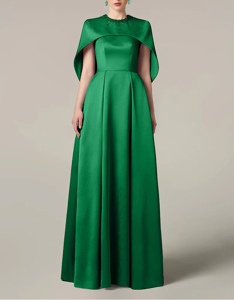 An enchanting emerald satin gown featuring a structured silhouette with a short cape overlay delicately adorned with tonal embellishments. The pleated A-line skirt adds refined movement, exuding regal elegance and timeless poise.