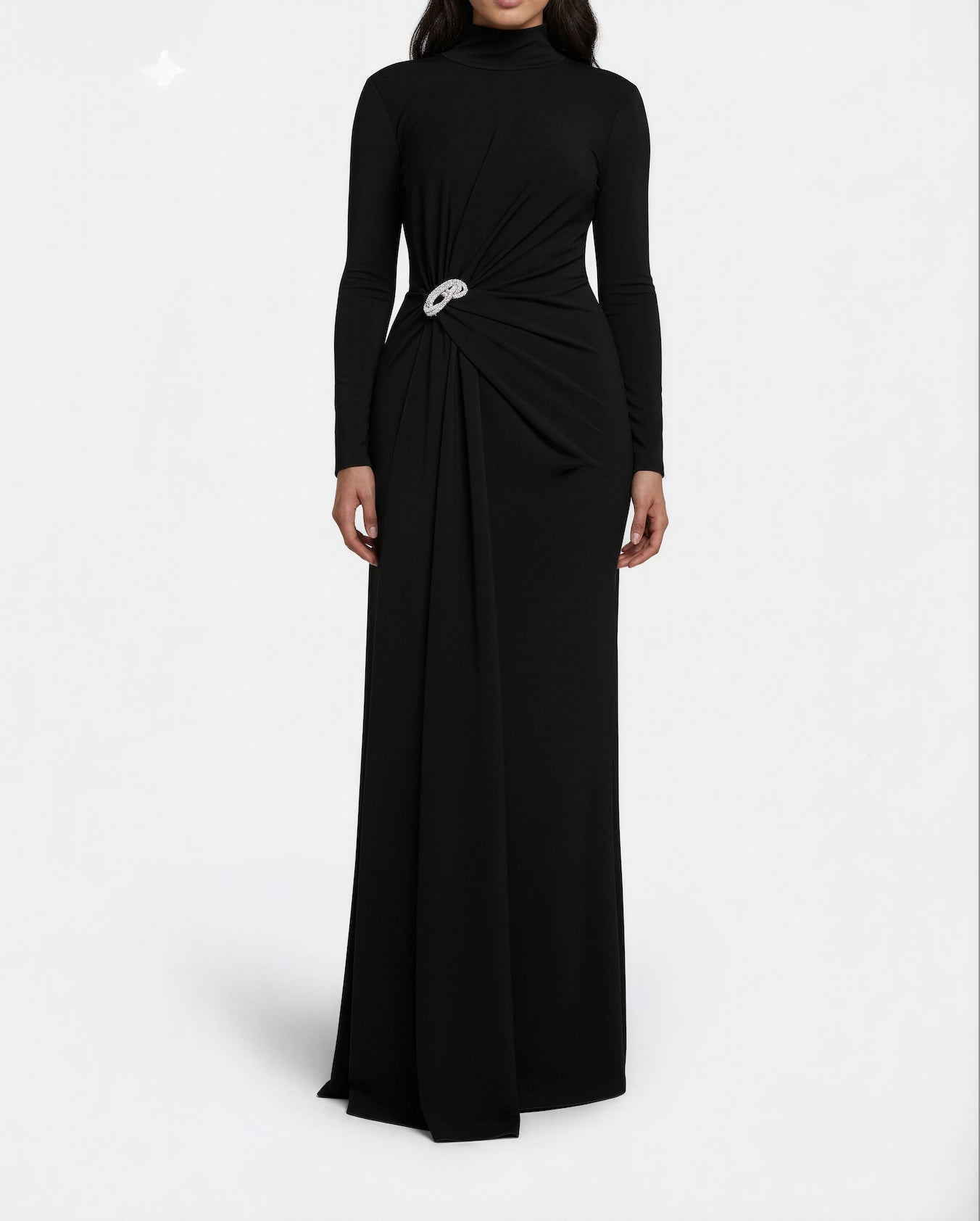 A refined black evening gown featuring a high neckline and full-length sleeves, enhanced by a gathered drape cinched at the waist with a radiant crystal brooch. Effortlessly graceful with a sculptural silhouette for formal elegance.