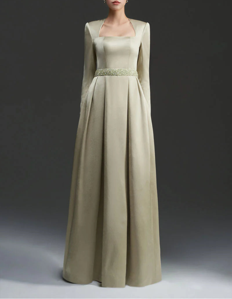 An elegant champagne-toned gown crafted from luxurious satin, featuring a structured square neckline and long sleeves. The crystal-embellished waistband accentuates the silhouette, creating a timeless and graceful evening look.