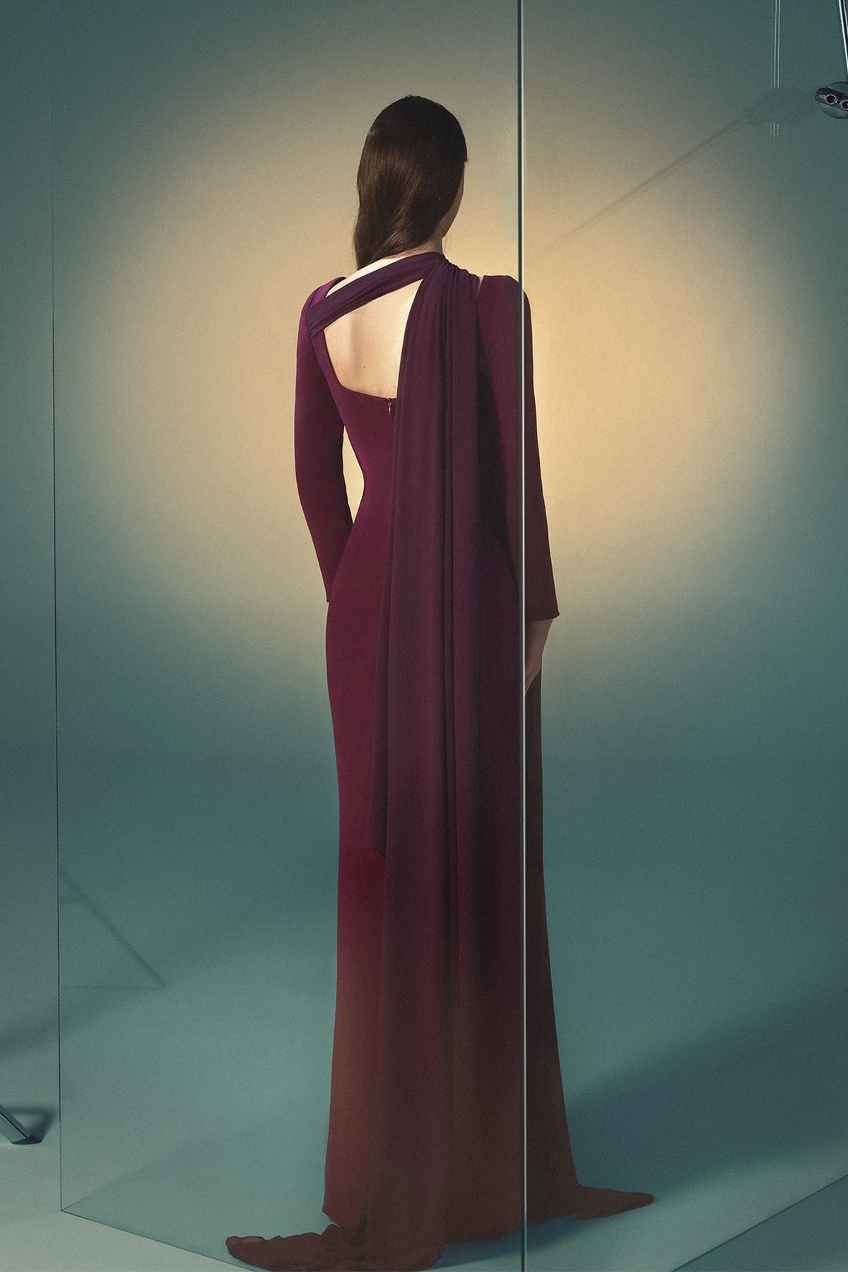 An elegant burgundy column gown designed with a refined asymmetric neckline and subtle cutout detail. Featuring long fitted sleeves and a fluid draped scarf that cascades gracefully along the silhouette, this dress exudes modern sophistication and understated drama. Perfect for evening events, formal occasions, and statement nights where timeless elegance meets contemporary design.
