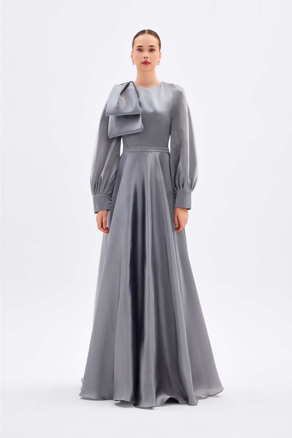long-sleeve satin gown with sculpted shoulder bow – FUCHSIAE – missodd.com