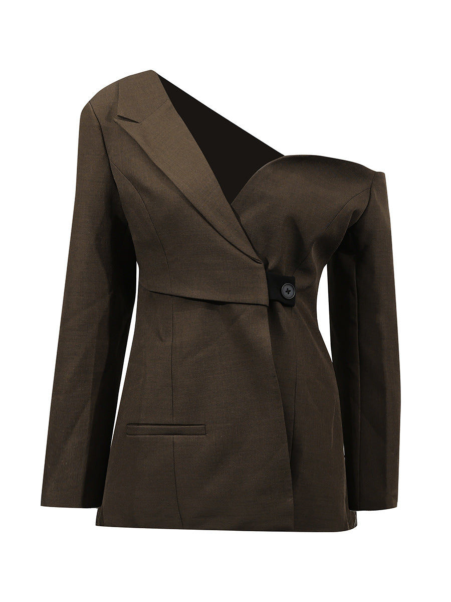 A bold asymmetric blazer featuring an off-shoulder neckline and structured tailoring. Its unique one-button closure creates a sculpted silhouette with effortless modern allure. Fabric name: polyester and cotton Size Shoulder (cm) Bust (cm) Waist (cm) Sleeve (cm) Length (cm) S 44 94 78 53–59 59–73 M 45 98 82 54–60 60–74 L 46 104 88 55–61 61–74