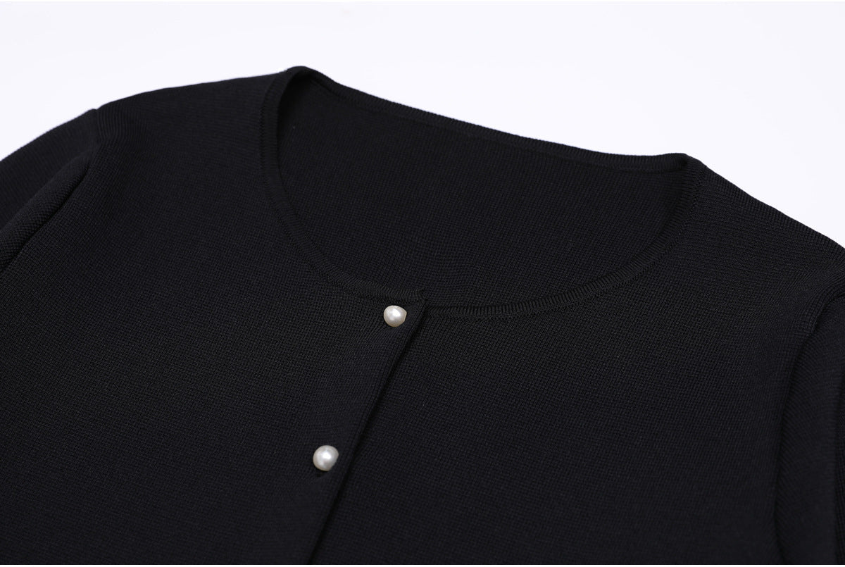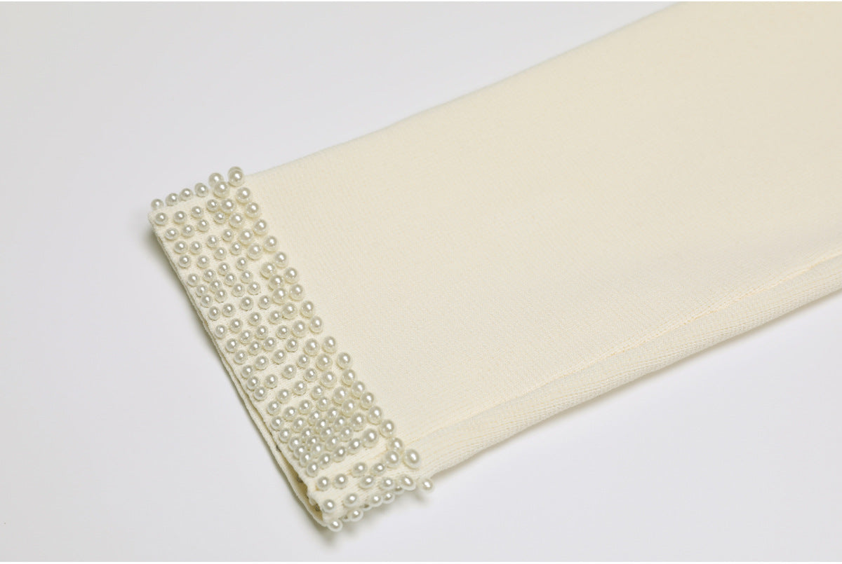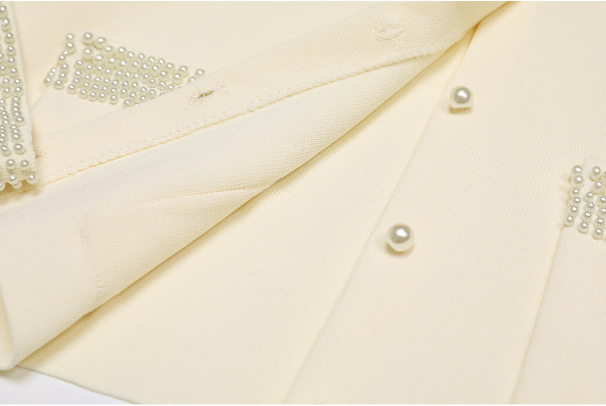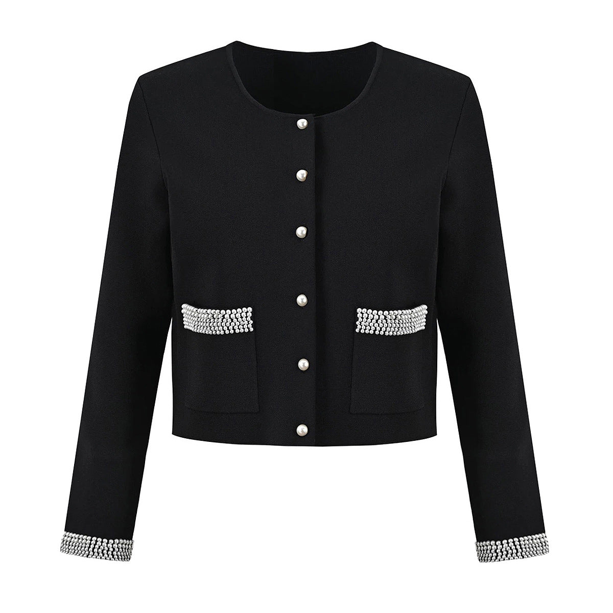 Elegant cropped tweed jacket featuring pearl buttons and shimmering pocket accents. A refined piece that pairs effortlessly with tailored pants or skirts for a polished, feminine look.