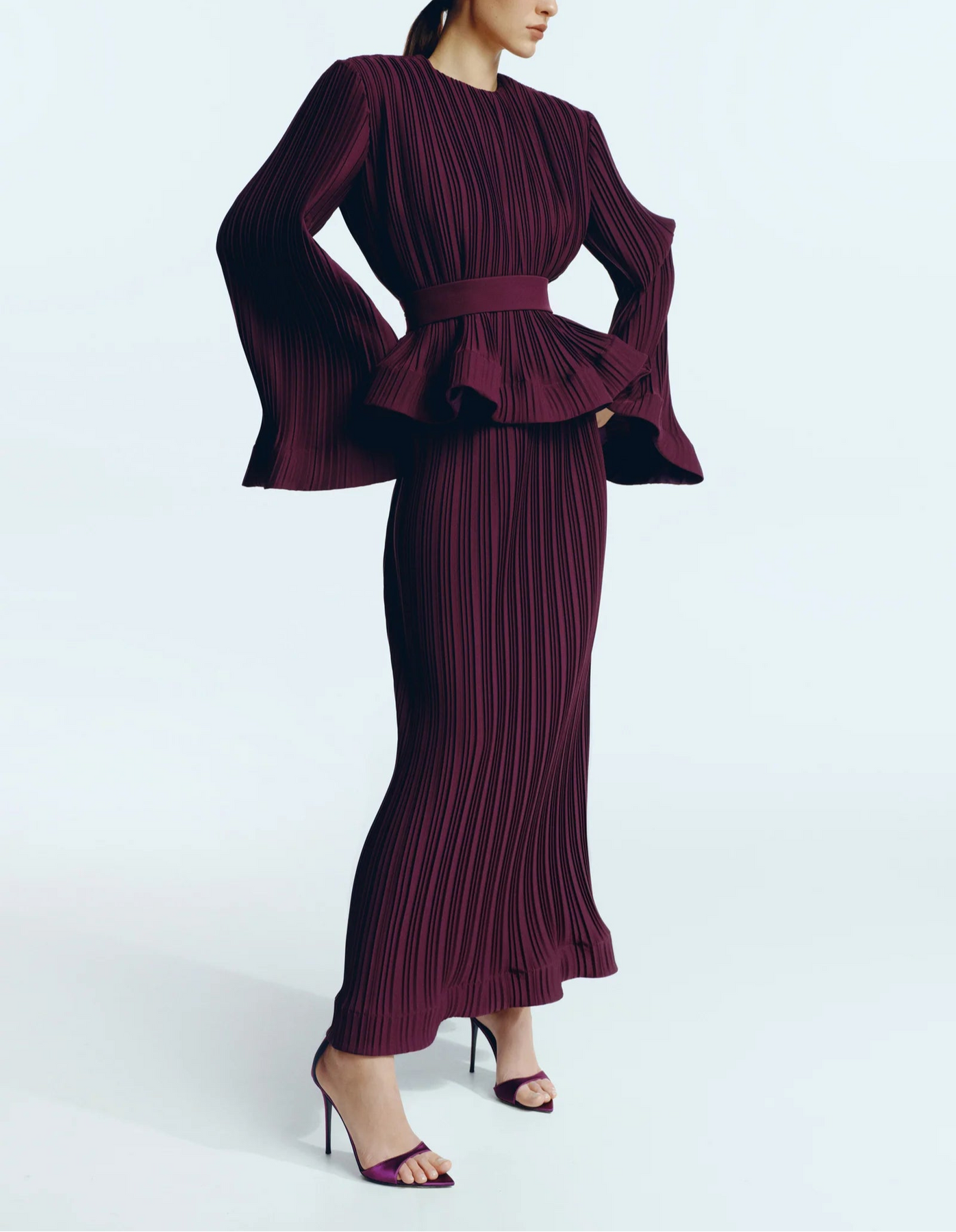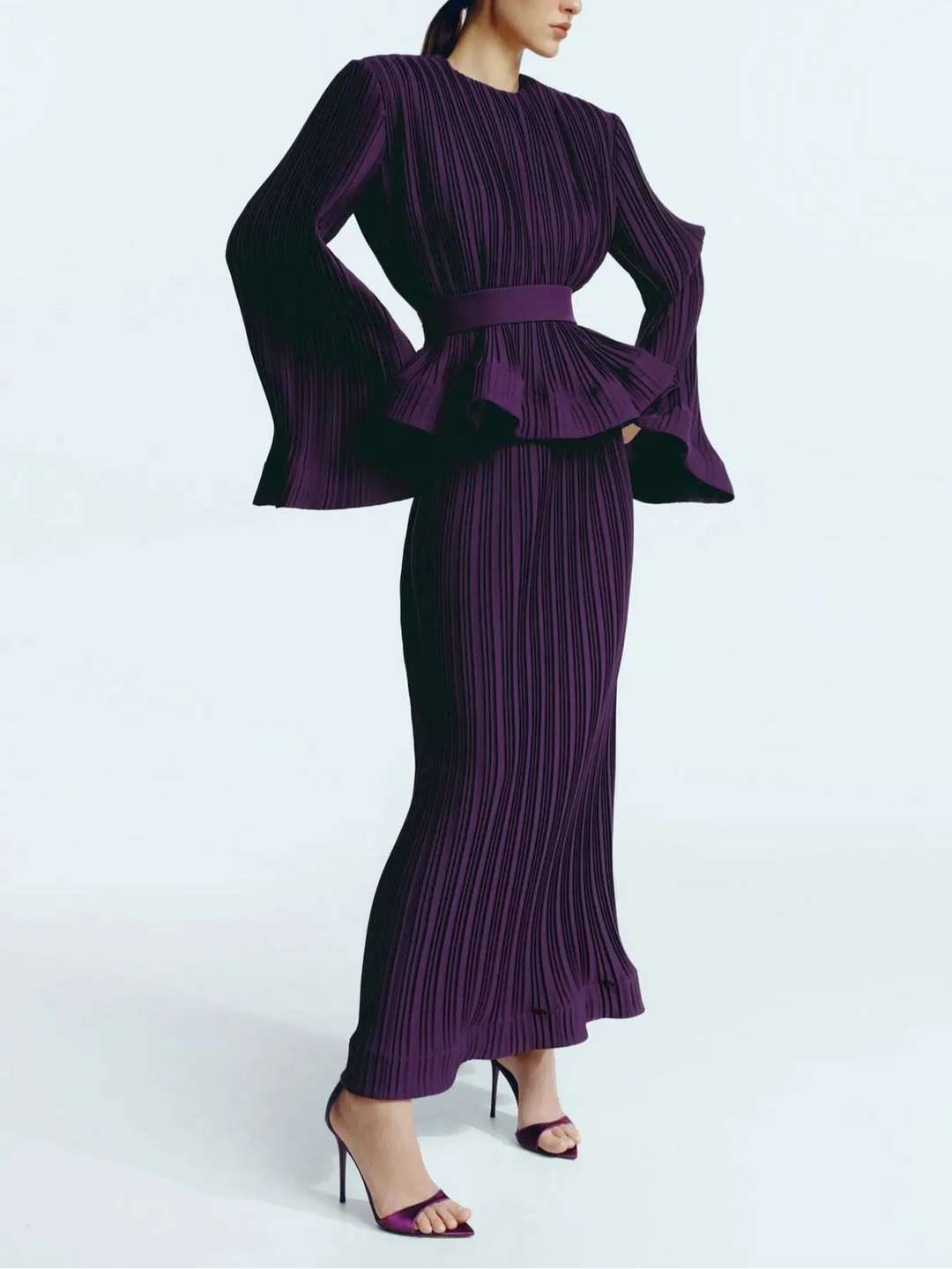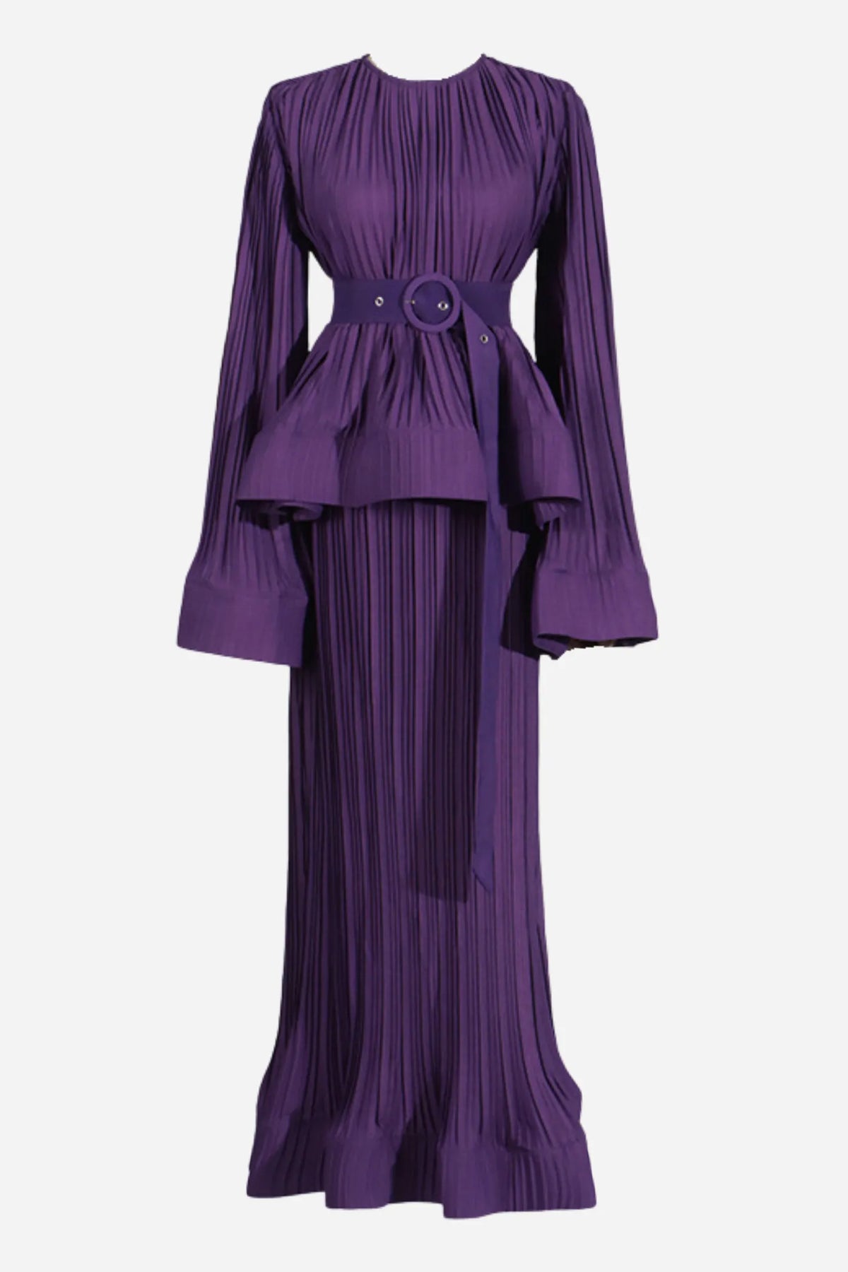 This elegant two-piece set features a rich pleated fabric, combining comfort and sophistication. The top is designed with flattering wide sleeves and a round neckline, accentuated by a matching belt at the waist to accentuate the dress's silhouette. The matching long skirt flows smoothly to the floor, creating a sophisticated and modern look, ideal for formal occasions or elegant events.