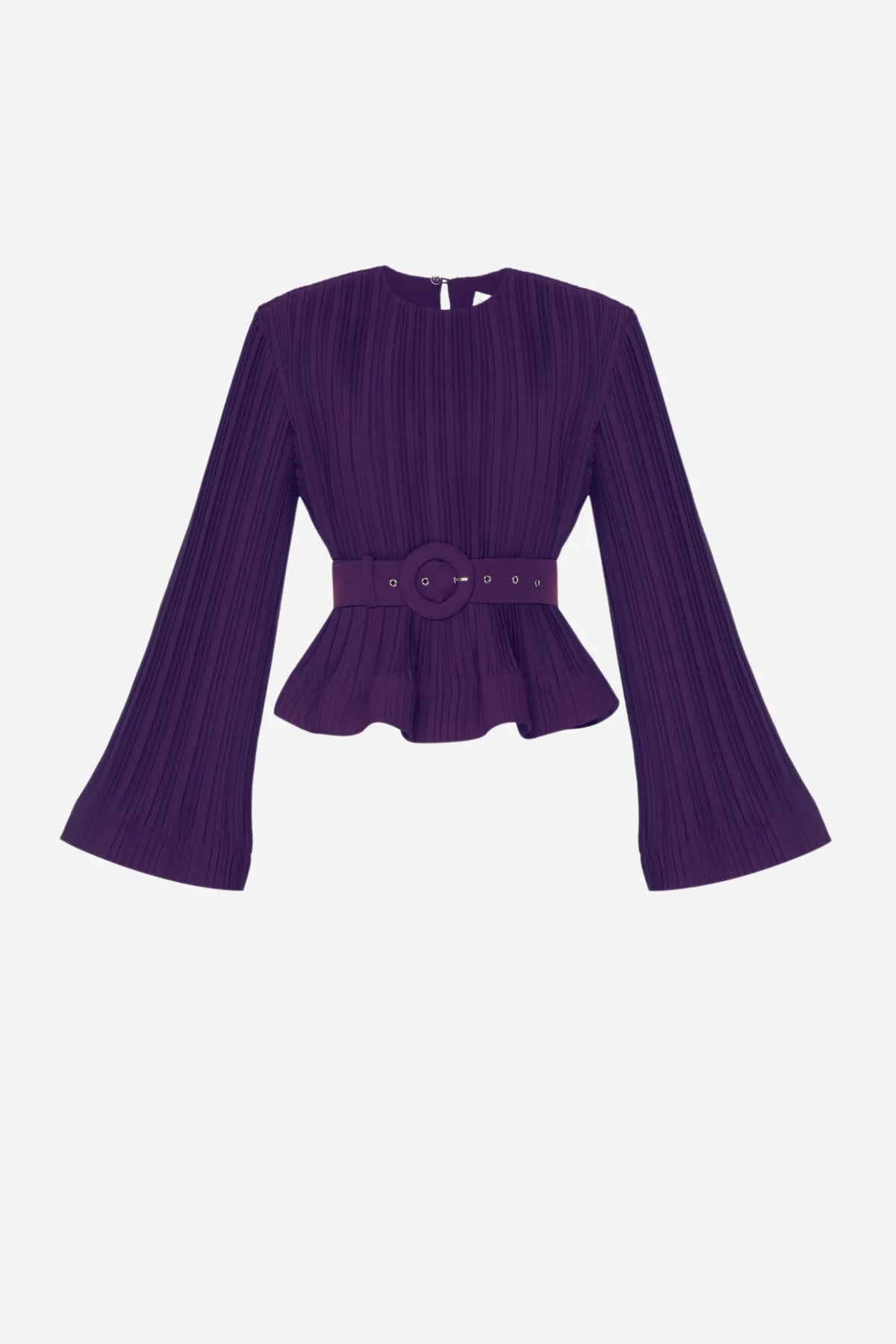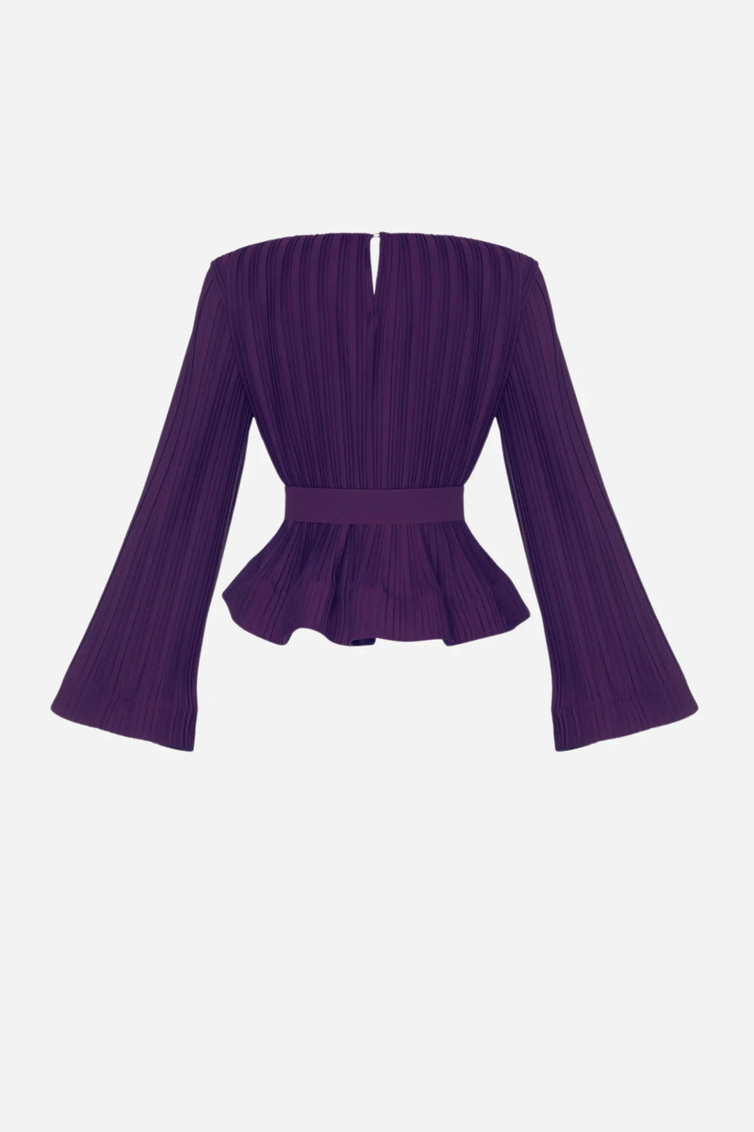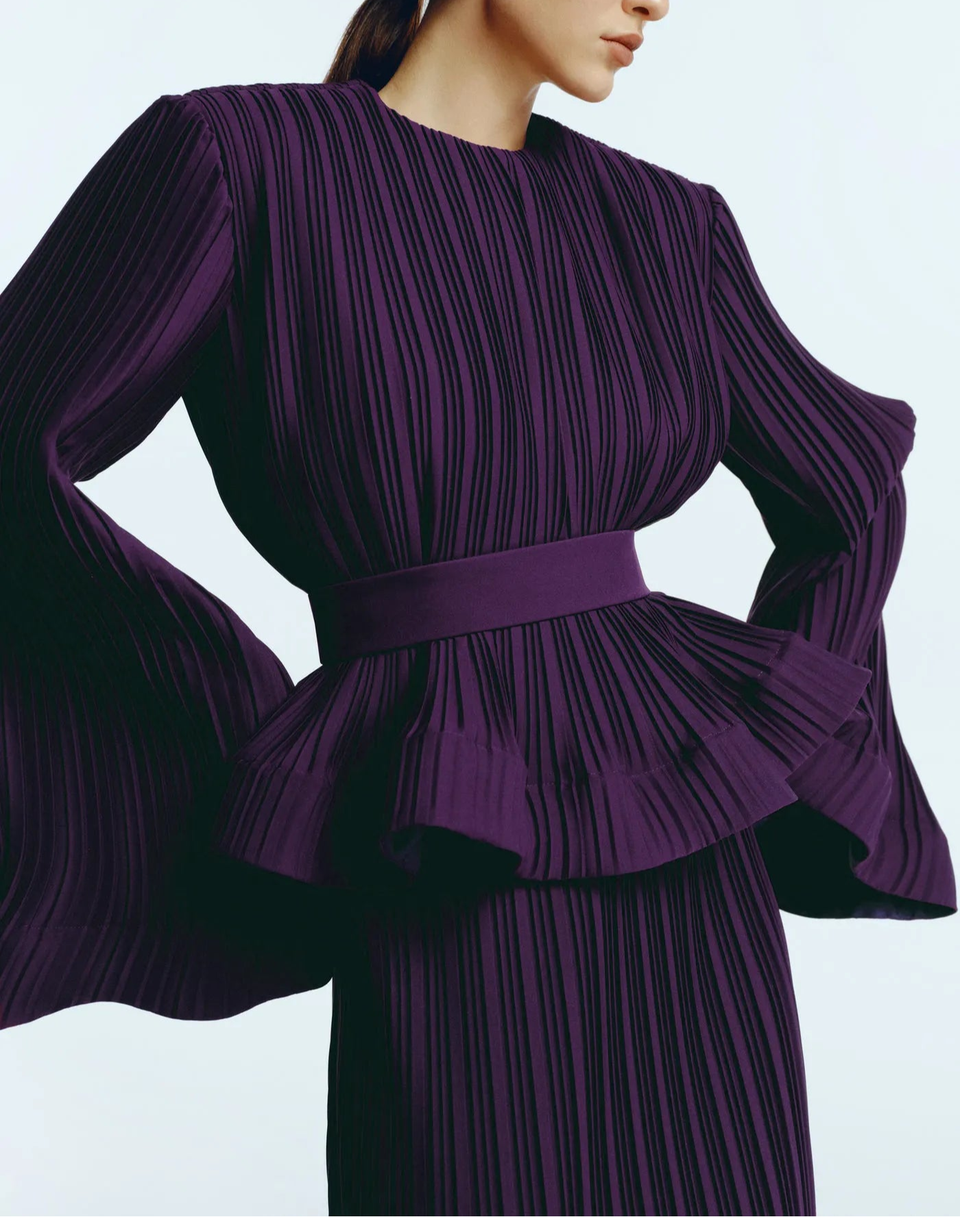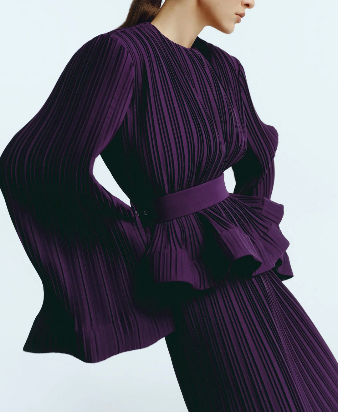 This elegant two-piece set features a rich pleated fabric, combining comfort and sophistication. The top is designed with flattering wide sleeves and a round neckline, accentuated by a matching belt at the waist to accentuate the dress's silhouette. The matching long skirt flows smoothly to the floor, creating a sophisticated and modern look, ideal for formal occasions or elegant events.