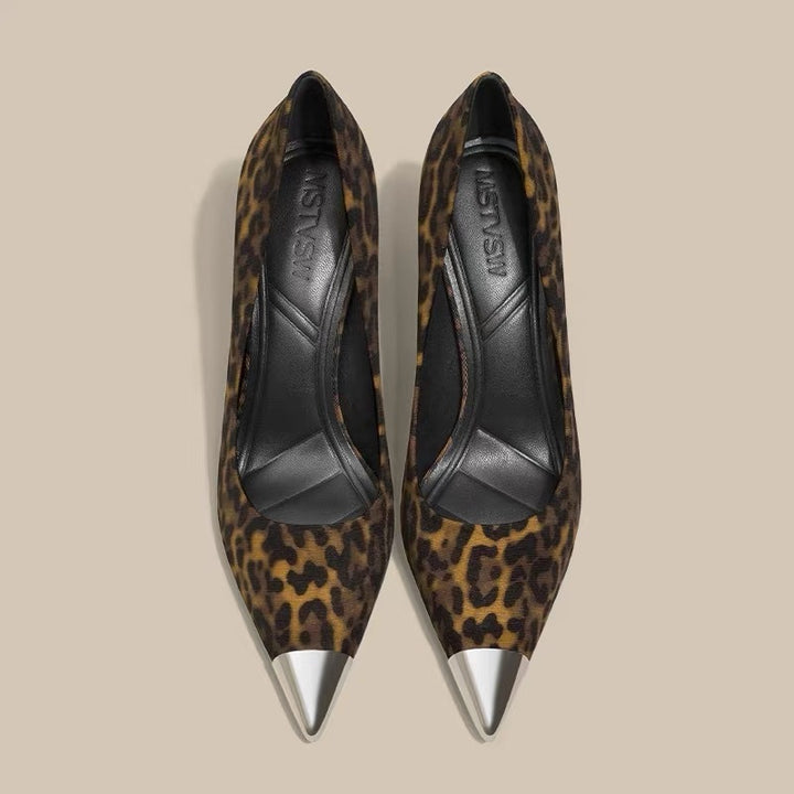 These high stiletto heels are a statement piece designed for the bold and fashion-forward. Covered in a fierce leopard print fabric, they exude confidence and wild charm. The pointed toe is elevated with a glossy metallic cap, adding an edgy, luxurious touch. The slim stiletto heel enhances the silhouette, making them perfect for nights out, special occasions, or whenever you want to turn heads. Stylish, strong, and unapologetically feminine.