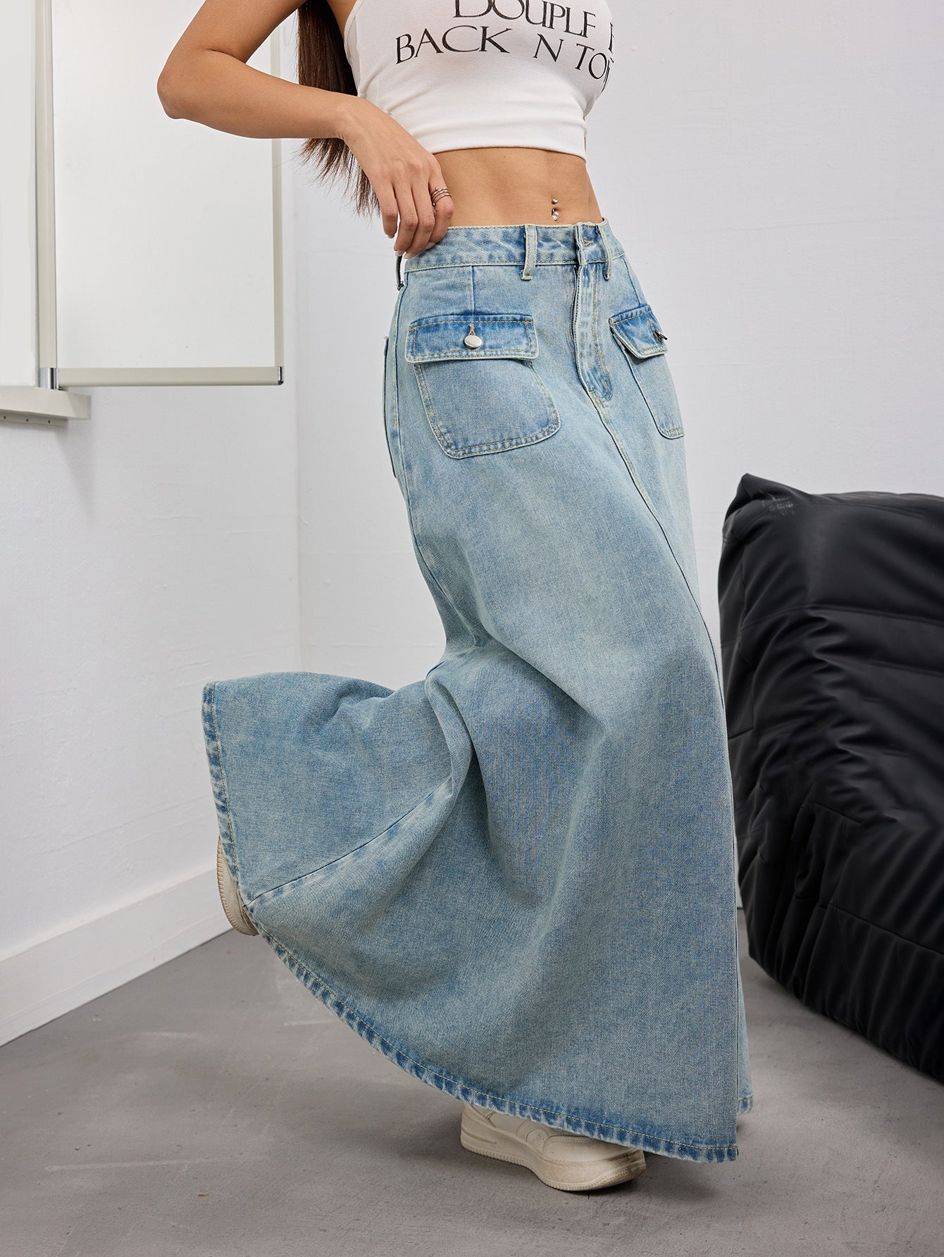 A chic denim maxi skirt designed with bold front flap pockets and a high-waist silhouette for a casual yet refined look. The slightly flared cut adds effortless movement—perfect for everyday styling with crop tops or tucked blouses.