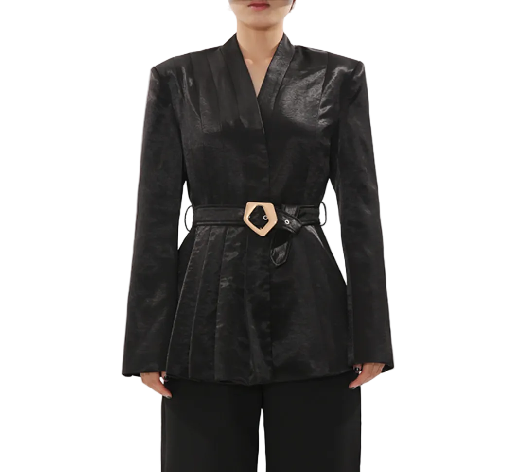 A refined satin-finish blazer designed with a deep V neckline, structured shoulders, and elegant vertical pleats that define the waist. Finished with a statement geometric belt buckle, this piece delivers a bold yet sophisticated silhouette—perfect for evening wear or elevated formal looks.