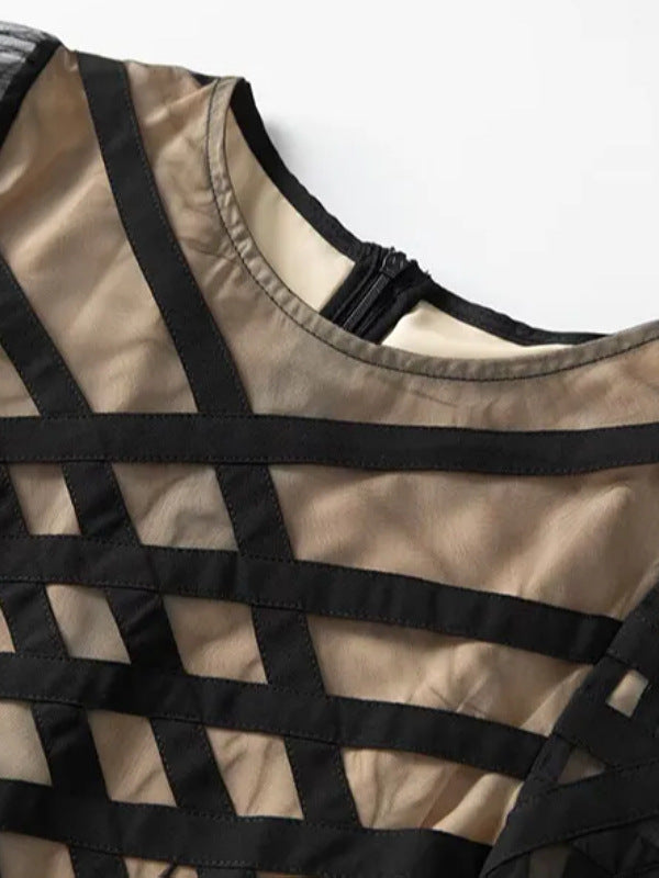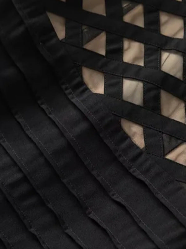 A sleek navy midi dress featuring a geometric mesh panel bodice and form-fitting bandage construction that sculpts the silhouette. Finished with a soft mermaid hem for a refined flow, it balances modern allure and timeless sophistication—ideal for evening events or cocktail occasions.