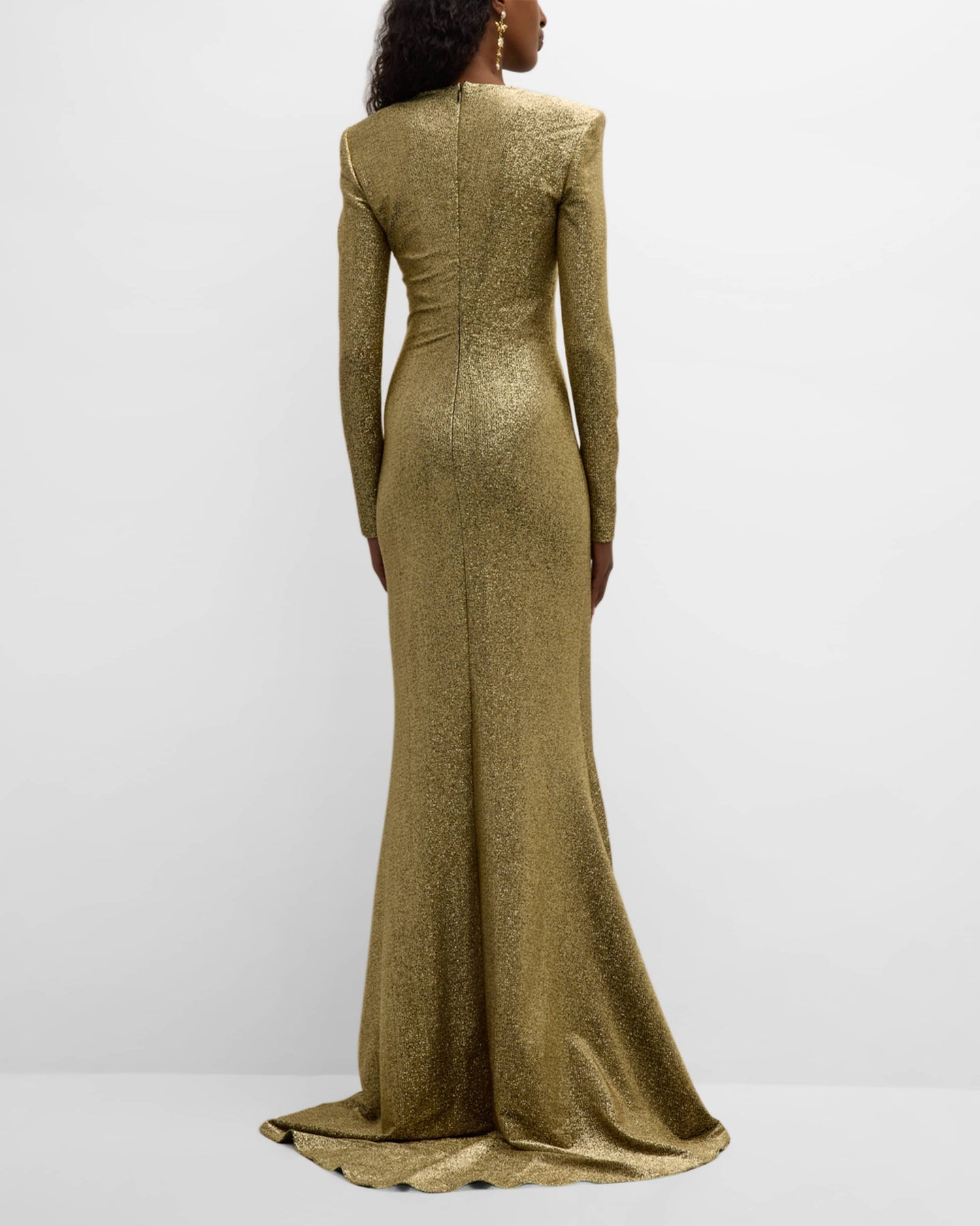 Radiant gold gown crafted in shimmering metallic fabric, featuring a fitted silhouette with structured shoulders and a graceful flared hem. A statement piece that exudes timeless glamour for evening occasions.