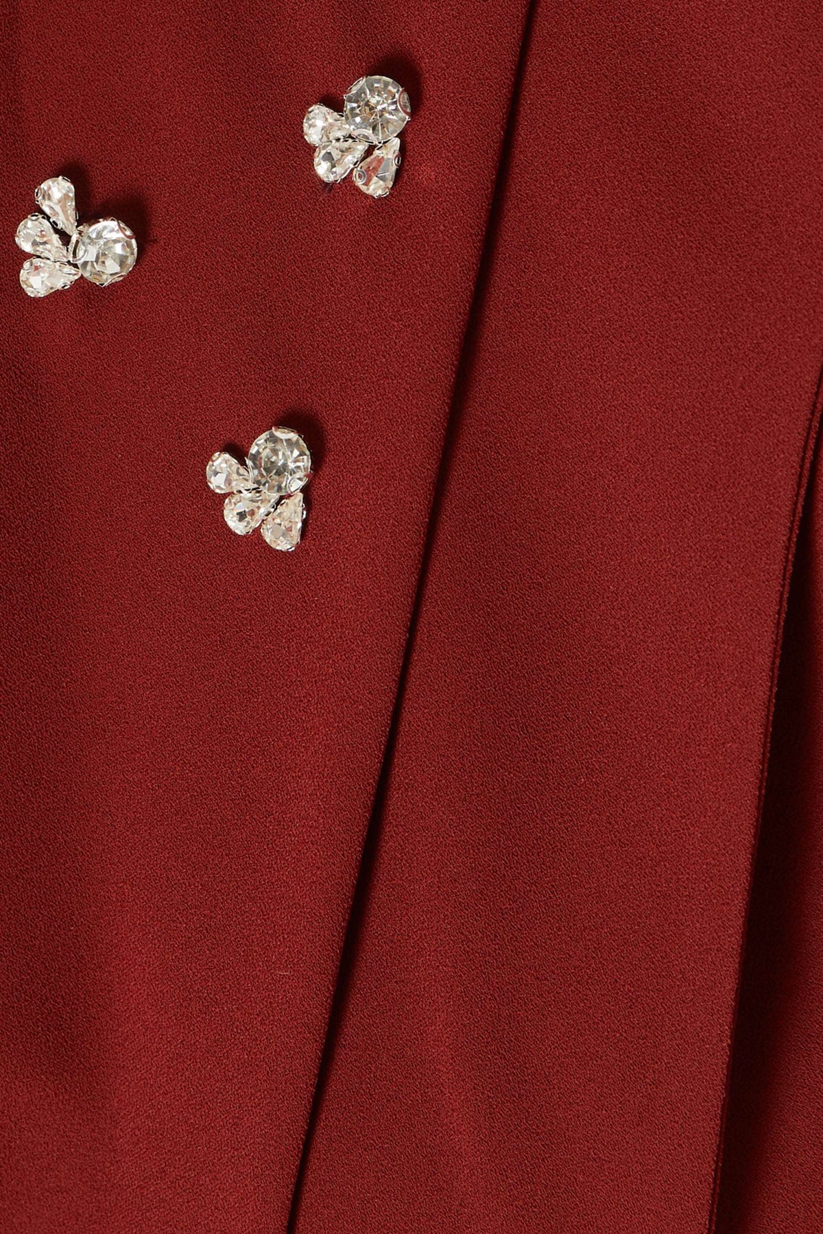 A deep burgundy midi dress featuring an elegant draped off-shoulder neckline adorned with sparkling embellishments, three-quarter sleeves, and a subtle front slit—timeless sophistication with a touch of glamour.