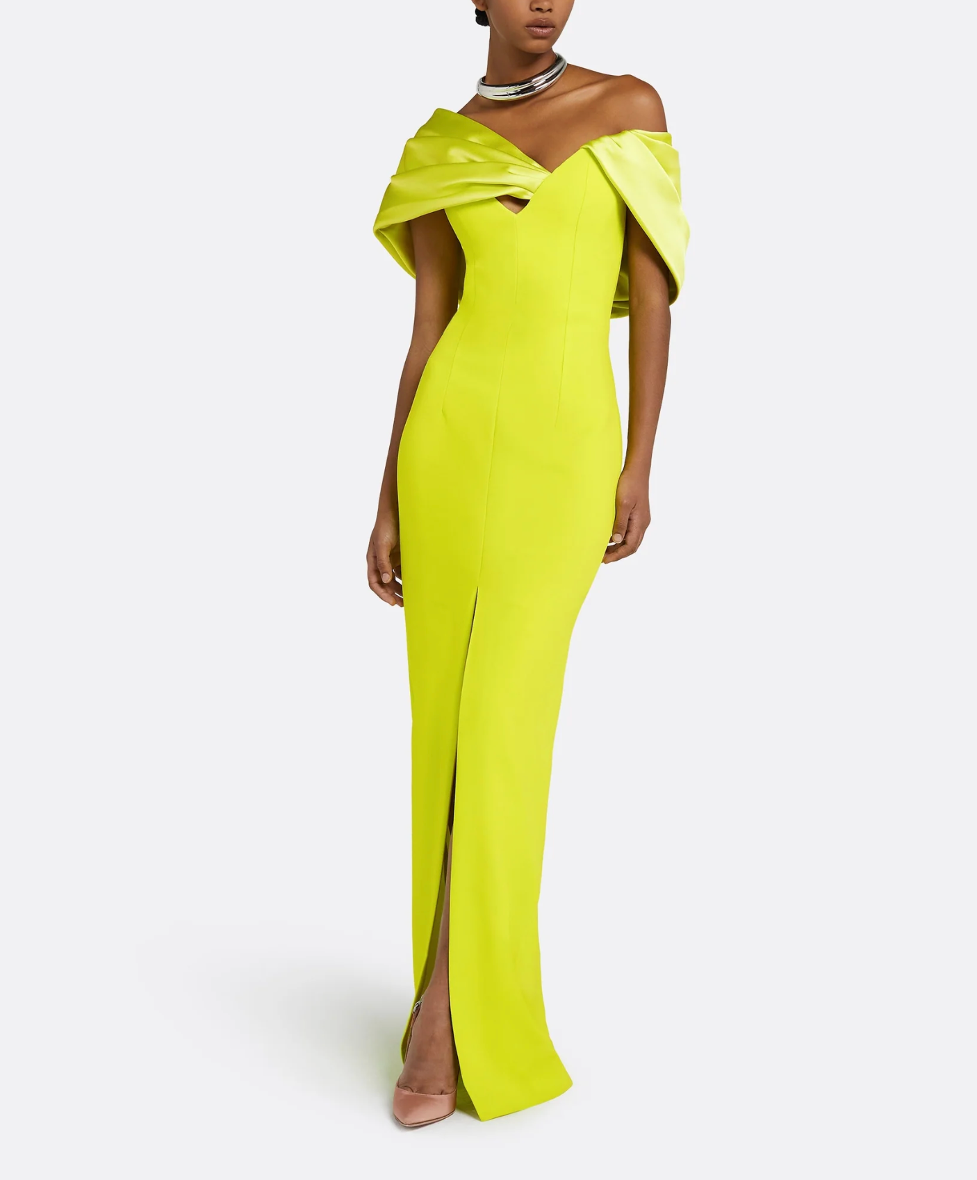 A bold lime-yellow gown featuring a sculpted off-shoulder neckline with draped satin folds and a sleek front slit. Contemporary and striking, this statement piece is perfect for glamorous evening occasions and red-carpet moments.