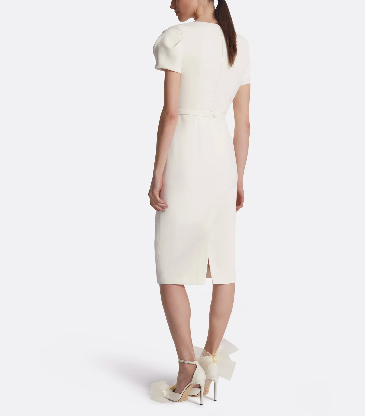 Elegant ivory pencil dress featuring a sculpted twisted neckline and short structured sleeves. The sleek fitted silhouette offers refined sophistication—ideal for cocktail parties, receptions, or formal gatherings.