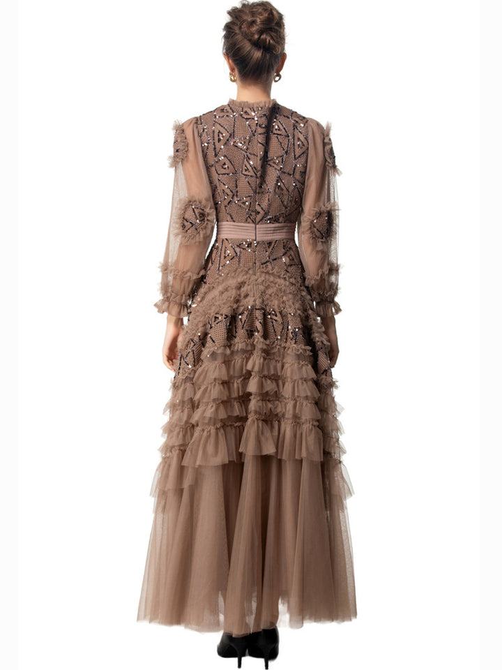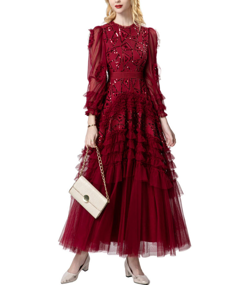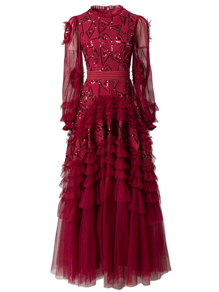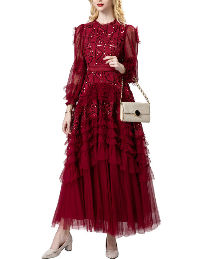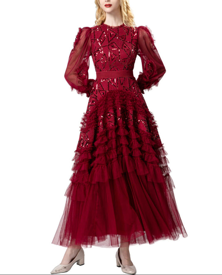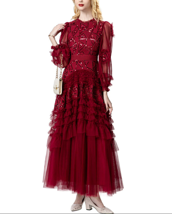 A striking gown in deep garnet red, featuring bold geometric sequin embroidery, sheer puffed sleeves, and cascading tulle ruffle tiers. The defined waistline and voluminous skirt bring dramatic flair—ideal for grand occasions and evening elegance.